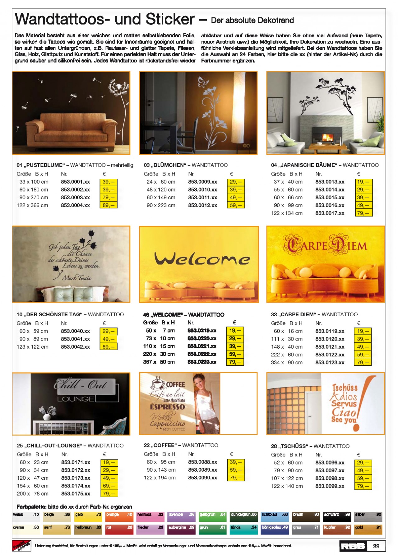INHALT: Wandtattoos- und Sticker Der absolute Dekotrend Das Material besteht aus einer weichen und matten selbstklebenden Folie, so wirken die Tattoos wie gemalt. Sie sind für Innenräume geeignet und halten auf fast allen Untergründen, z.B. Raufaser- und glatter Tapete, Fliesen, Glas, Holz, Glattputz und Kunststoff. Für einen perfekten Halt muss der Untergrund sauber und silikonfrei sein. Jedes Wandtattoo ist rückstandsfrei wieder ablösbar und auf diese Weise haben Sie ohne viel Aufwand (neue Tapete, neuer Anstrich usw.) die Möglichkeit, Ihre Dekoration zu wechseln. Eine ausführliche Verklebeanleitung wird mitgeliefert. Bei den Wandtattoos haben Sie die Auswahl an 24 Farben, hier bitte die xx (hinter der Artikel-Nr.) durch die Farbnummer ergänzen. 01 ,,PUSTEBLUME" WANDTATTOO mehrteilig Größe B x H 33 x 100 cm 60 x 180 cm 90 x 270 cm 122 x 366 cm Nr. 853.0001.xx 853.0002.xx 853.0003.xx 853.0004.xx 39,-- 39,-- 79,-- 89,-- 03 ,,BLÜMCHEN" WANDTATTOO Größe B x H 24 x 60 cm 48 x 120 cm 60 x 149 cm 90 x 223 cm Nr. 853.0009.xx 853.0010.xx 853.0011.xx 853.0012.xx 29,-- 39,-- 49,-- 59,-- 04 ,,JAPANISCHE BÄUME" WANDTATTOO Größe B x H 37 x 40 cm 55 x 60 cm 60 x 66 cm 90 x 99 cm 122 x 134 cm Nr. 853.0013.xx 853.0014.xx 853.0015.xx 853.0016.xx 853.0017.xx 19,-- 29,-- 39,-- 49,-- 79,-- 10 ,,DER SCHÖNSTE TAG" WANDTATTOO Größe B x H 60 x 59 cm 90 x 89 cm 123 x 122 cm Nr. 853.0040.xx 853.0041.xx 853.0042.xx 29,-- 49,-- 59,-- 46 ,,WELCOME" WANDTATTOO Größe B x H Nr. 50 x 7 cm 853.0219.xx 73 x 10 cm 853.0220.xx 110 x 15 cm 853.0221.xx 220 x 30 cm 853.0222.xx 367 x 50 cm 853.0223.xx 33 ,,CARPE DIEM" WANDTATTOO 19,-- 29,-- 39,-- 59,-- 79,-- Größe 60 x 111 x 148 x 222 x 334 x BxH 16 cm 30 cm 40 cm 60 cm 90 cm Nr. 853.0119.xx 853.0120.xx 853.0121.xx 853.0122.xx 853.0123.xx 19,-- 39,-- 49,-- 59,-- 79,-- 25 ,,CHILL-OUT-LOUNGE" WANDTATTOO Größe 60 x 90 x 120 x 154 x 200 x BxH 23 cm 34 cm 47 cm 60 cm 78 cm Nr. 853.0171.xx 853.0172.xx 853.0173.xx 853.0174.xx 853.0175.xx 19,-- 29,-- 49,-- 69,-- 79,-- 22 ,,COFFEE" WANDTATTOO Größe B x H 60 x 95 cm 90 x 143 cm 122 x 194 cm Nr. 853.0088.xx 853.0089.xx 853.0090.xx 39,-- 59,-- 79,-- 28 ,,TSCHÜSS" WANDTATTOO Größe B x H 52 x 60 cm 79 x 90 cm 107 x 122 cm 122 x 140 cm Nr. 853.0096.xx 853.0097.xx 853.0098.xx 853.0099.xx 29,-- 49,-- 59,-- 79,-- Farbpalette: bitte die xx durch Farb-Nr. ergänzen weiss creme .10 .30 beige senf .33 .73 gelb hellbraun .70 .83 orange rot .40 .20 hellrosa flieder .22 .23 lavendel .26 gelbgrün grün .64 .61 dunkelgrün .60 türkis .54 lichtblau .56 braun grau .80 .71 schwarz kupfer .99 .92 silber gold .90 .91 aubergine .29 königsblau .49 Lieferung frachtfrei, für Bestellungen unter 100,- + MwSt. wird anteilige Verpackungs- und Versandkostenpauschale von 5,- + MwSt. berechnet. 39