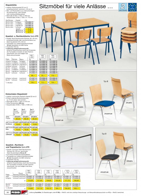 INHALT: Stapelstühle · stabiles Stahlrohrgestell 22 mm Ø pulverbeschichtet, verchromt = 20 mm Ø · Sitz- und Rückenlehne aus mehrschichtigem Buchensperrholz, natur lackiert oder nussbaumfarbig gebeizt · Sitzmaße: B 400 x T 400 x H 450 mm Gesamtmaße: B 460 x T 550 x H 770 mm Sitz/Rücken Buche natur Buche natur Buche natur Buche natur Gestell lichtgrau violettblau sepiabraun schwarz einzeln 20 Stück je 50 Stück je Nr. 270.0063.73 270.0063.76 270.0063.78 270.0063.79 33,20 31,60 30,70 Sitzmöbel für viele Anlässe ... Jahre Garantie 2 Made in Europe Quadrat- u. Rechtecktische Serie 270 · Gestell: Stahl-Rechteckrohr-Rahmen 40 x 20 mm, pulverbeschichtete oder verchromte Beine aus Stahl-Quadratrohr 30 x 30 mm · Tischplatte aus melaminharzbeschichteter 19 mm Spanplatte mit ABS-Kante · Tischhöhe 720 mm · Lieferung zerlegt kartonverpackt, einfacher Zusammenbau durch den Anwender, die Tischplatte ist bereits mit dem Rahmen verschraubt, hier sind lediglich die Beine anzuschrauben 800 x 800 Platte Rahmen Beine Nr. lichtgrau lichtgrau lichtgrau 270.0064.33 lichtgrau violettblau violettblau 270.0064.36 lichtgrau sepiabraun sepiabraun 270.0064.38 lichtgrau schwarz schwarz 270.0064.39 Buche* lichtgrau lichtgrau 270.0064.73 Buche* violettblau violettblau 270.0064.76 Buche* sepiabraun sepiabraun 270.0064.78 Buche* schwarz schwarz 270.0064.79 1200 x 800 Nr. 270.0065.33 270.0065.36 270.0065.38 270.0065.39 270.0065.73 270.0065.76 270.0065.78 270.0065.79 1600 x 800 Nr. 270.0066.33 270.0066.36 270.0066.38 270.0066.39 270.0066.73 270.0066.76 270.0066.78 270.0066.79 86, lichtgrau schwarz Buche* schwarz verchromt verchromt 270.0067.30 270.0067.70 95, 270.0068.30 270.0068.70 116, 270.0069.30 270.0069.70 *= Struktur 104, 112, 134, Typ 2 Holzschalen-Stapelstuhl · stabiles verchromtes Stahlrohr-Gestell 20 mm Ø · 8-fach verleimte Buchenholzschale, ca. 10 mm stark, natur lackiert · Sitzmaße: B 420 x T 400 x H 470 mm · Höhe Rückenlehne 450 mm · Gesamtmaße: B 500 x T 590 x H 850 mm Typ 1 270.0072 270.0070 Typ 1 Rücken gerundet Nr. ohne Polster 270.0070 Typ 2 Rücken gerade Nr. 270.0072 Typ 3 Rücken tailliert Nr. 270.0074 270.0073.60 66,40 66,40 66,40 270.0071.20 mit Polster 270.0071.20 270.0073.20 270.0075.20 bordeaux 79,40 79,40 79,40 mit Polster 270.0071.60 270.0073.60 270.0075.60 blau 79,40 79,40 79,40 mit Polster 270.0071.90 270.0073.90 270.0075.90 anthrazit 79,40 79,40 79,40 Typ 3 Quadrat-, Rechteckund Trapeztische Serie 270 · Gestell: schwarzer Stahl-RechteckrohrRahmen 40 x 20 mm, verchromte Stahl-Rundrohrbeine 35 mm Ø · mit höhenverstellbaren Bodengleitern · Tischplatte aus melaminharzbeschichteter 25 mm Spanplatte mit ABS-Umleimer · Tischhöhe 720 mm · Lieferung zerlegt kartonverpackt, einfacher Zusammenbau durch den Anwender, die Tischplatte ist bereits mit dem Rahmen verschraubt, hier sind lediglich die Beine anzuschrauben 800 x 800 RundRahmen rohrbeine Nr. schwarz verchromt 270.0057.10 schwarz verchromt 270.0057.30 1200 x 800 Nr. 270.0058.10 270.0058.30 1400 x 700 Nr. 270.0059.10 270.0059.30 1600 x 800 Nr. 270.0060.10 270.0060.30 1400 x 700 Nr. 270.0061.10 270.0061.30 1600 x 800 Nr. 270.0062.10 270.0062.30 270.0075.90 270.0074 Platte weiß lichtgrau 113,20 Buche* schwarz verchromt 270.0057.70 schwarz verchromt 270.0057.71 Ahorn* *= Struktur 118,60 127,90 270.0058.70 270.0058.71 138,80 270.0059.70 270.0059.71 143,40 270.0060.70 270.0060.71 177,70 270.0061.70 270.0061.71 185,60 270.0062.70 270.0062.71 137,70 152,70 164, 194,40 202, 44 Lieferung frachtfrei, für Bestellungen unter 100, + MwSt. wird eine anteilige Verpackungs- und Versandkostenpauschale von 5, + MwSt. berechnet.