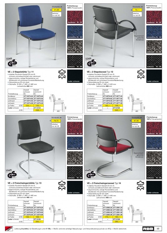 INHALT: Stückpreis ab Polsterbezug: 100% Polyopropylen Stückpreis ab Polsterbezug: 100% Polyopropylen 61,85 lieferbar nur als VE 70, lieferbar nur als VE bordeaux Nr. .24 bordeaux Nr. .24 dunkelblau Nr. .62 Ergonomisch geformte Armlehnen dunkelblau Nr. .62 anthrazit Nr. .92 anthrazit Nr. .92 schwarz Nr. .99 schwarz Nr. .99 VE = 2 Stapelstühle Typ 11 · stabiles Rundrohr-Gestell 25 mm Ø, schwarz pulverbeschichtet oder verchromt · ergonomische, eckige Rückenlehne und Muldensitz mit schwarzer Kunststoffabdeckung · Sitzpolsterung 35 mm stark · Sitzmaße: B 460 x T 480 x H 460 mm Lehnenhöhe 460 mm Gestell schwarz Nr. 277.0074.24 277.0074.62 277.0074.92 277.0074.99 Gestell verchromt Nr. 277.0075.24 277.0075.62 277.0075.92 277.0075.99 VE = 2 Stapelsessel Typ 12 · stabiles Rundrohr-Gestell 25 mm Ø, schwarz pulverbeschichtet oder verchromt · ergonomische, eckige Rückenlehne und Muldensitz mit schwarzer Kunststoffabdeckung · Sitzpolsterung 35 mm stark · Sitzmaße: B 460 x T 480 x H 460 mm Lehnenhöhe 460 mm Gestell schwarz Nr. 277.0076.24 277.0076.62 277.0076.92 277.0076.99 Gestell verchromt Nr. 277.0077.24 277.0077.62 277.0077.92 277.0077.99 Leder schwarz Leder schwarz Polsterbezug bordeaux dunkelblau anthrazit schwarz je Farbe /VE Leder schwarz /VE 480 460 277.0123 277.0124 228, 460 245, 460 Stückpreis ab 79,75 lieferbar nur als VE Polsterbezug: 100% Polyopropylen 460 Stückpreis ab 124, 133, Polsterbezug bordeaux dunkelblau anthrazit schwarz je Farbe /VE Leder schwarz /VE 460 460 480 140, 149, 87,90 lieferbar nur als VE Polsterbezug: 100% Polyopropylen bordeaux Nr. .24 bordeaux Nr. .24 dunkelblau Nr. .62 Ergonomisch geformte Armlehnen dunkelblau Nr. .62 anthrazit Nr. .92 anthrazit Nr. .92 schwarz Nr. .99 schwarz Nr. .99 VE = 2 Freischwingerstühle Typ 13 · stabiles Rundrohr-Gestell 25 mm Ø, schwarz pulverbeschichtet oder verchromt · ergonomische, eckige Rückenlehne und Muldensitz mit schwarzer Kunststoffabdeckung · Sitzpolsterung 35 mm stark · Sitzmaße: B 460 x T 480 x H 460 mm Lehnenhöhe 460 mm Gestell schwarz Nr. 277.0078.24 277.0078.62 277.0078.92 277.0078.99 Gestell verchromt Nr. 277.0079.24 277.0079.62 277.0079.92 277.0079.99 VE = 2 Freischwingersessel Typ 14 · stabiles Rundrohr-Gestell 25 mm Ø, schwarz pulverbeschichtet oder verchromt · ergonomische, eckige Rückenlehne und Muldensitz mit schwarzer Kunststoffabdeckung · Sitzpolsterung 35 mm stark · Sitzmaße: B 460 x T 480 x H 460 mm Lehnenhöhe 460 mm Gestell schwarz Nr. 277.0080.24 277.0080.62 277.0080.92 277.0080.99 Gestell verchromt Nr. 277.0081.24 277.0081.62 277.0081.92 277.0081.99 Leder schwarz Leder schwarz Polsterbezug bordeaux dunkelblau anthrazit schwarz je Farbe /VE Leder schwarz /VE 480 460 277.0125 277.0126 264, 460 280, 460 460 159, 169, Polsterbezug: bordeaux dunkelblau anthrazit schwarz je Farbe /VE Leder schwarz /VE 460 460 480 175, 185, Lieferung frachtfrei, für Bestellungen unter 100, + MwSt. wird eine anteilige Verpackungs- und Versandkostenpauschale von 5, + MwSt. berechnet. 49