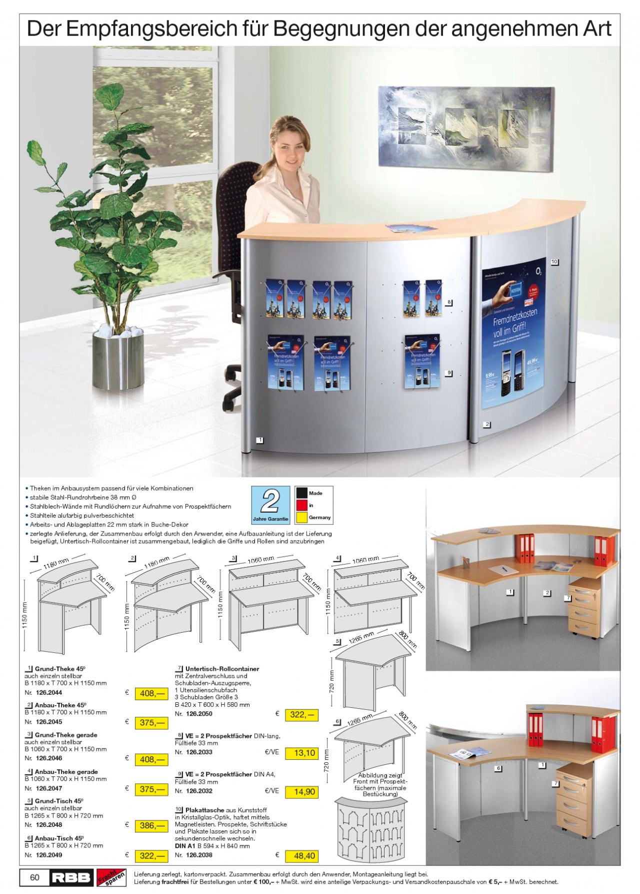 INHALT: Der Empfangsbereich für Begegnungen der angenehmen Art 10 8 9 2 1 · Theken im Anbausystem passend für viele Kombinationen Made · stabile Stahl-Rundrohrbeine 38 mm Ø in · Stahlblech-Wände mit Rundlöchern zur Aufnahme von Prospektfächern · Stahlteile alufarbig pulverbeschichtet Germany Jahre Garantie · Arbeits- und Ablageplatten 22 mm stark in Buche-Dekor · zerlegte Anlieferung, der Zusammenbau erfolgt durch den Anwender, eine Aufbauanleitung ist der Lieferung beigefügt, Untertisch-Rollcontainer ist zusammengebaut, lediglich die Griffe und Rollen sind anzubringen 2 m 1 118 0m m 2 118 0m m 3 1060 m 4 1060 m m 70 0 m 70 1150 mm m 1150 mm 0 70 m 0 70 m m 0 m 1150 mm m m 1 2 7 1150 mm 5 126 5m m 80 0 m m 1 Grund-Theke 450 auch einzeln stellbar B 1180 x T 700 x H 1150 mm Nr. 126.2044 408, Anbau-Theke 450 B 1180 x T 700 x H 1150 mm Nr. 126.2045 Grund-Theke gerade auch einzeln stellbar B 1060 x T 700 x H 1150 mm Nr. 126.2046 4 Anbau-Theke gerade B 1060 x T 700 x H 1150 mm Nr. 126.2047 5 Grund-Tisch 450 auch einzeln stellbar B 1265 x T 800 x H 720 mm Nr. 126.2048 3 2 7 Untertisch-Rollcontainer mit Zentralverschluss und Schubladen-Auszugsperre, 1 Utensilienschubfach 3 Schubladen Größe 3 B 420 x T 600 x H 580 mm Nr. 126.2050 720 mm 375, VE = 2 Prospektfächer DIN-lang, Fülltiefe 33 mm /VE Nr. 126.2033 8 322,-- 6 126 5m m 80 0 m m 408, VE = 2 Prospektfächer DIN A4, Fülltiefe 33 mm /VE Nr. 126.2032 10 Plakattasche aus Kunststoff in Kristallglas-Optik, haftet mittels Magnetleisten. Prospekte, Schriftstücke und Plakate lassen sich so in sekundenschnelle wechseln. DIN A1 B 594 x H 840 mm Nr. 126.2038 9 13,10 720 mm 6 1 375, 14,90 Abbildung zeigt Front mit Prospektfächern (maximale Bestückung) 7 386, Anbau-Tisch 450 B 1265 x T 800 x H 720 mm Nr. 126.2049 6 322, 48,40 60 Lieferung zerlegt, kartonverpackt. Zusammenbau erfolgt durch den Anwender, Montageanleitung liegt bei. Lieferung frachtfrei für Bestellungen unter 100, + MwSt. wird eine anteilige Verpackungs- und Versandkostenpauschale von 5, + MwSt. berechnet.