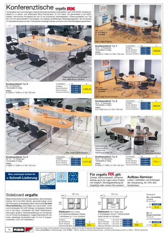 INHALT: Konferenztische orgafix RK Tischplatten aus hochwertigen melaminharzbeschichteten Spanplatten nach DIN 68765, Emissionsklasse E1 in blend- und reflexfreier Micro-Feinstruktur. 25 mm stark, mit gerundeten 2-mm-ABSKanten. Verchromte Rundbeine 60 mm Ø mit schwarzen Verstellgleitern, höhenverstellbar von 720 bis 745 mm (einschließlich Tischplatte), mit stabiler, großflächiger Befestigungsplatte, die mit jeweils 12 Spezialschrauben an den Tischplatten befestigt werden und eine hohe Standfestigkeit garantieren. Abb. zeigt Nr. 214.0245.11 + 214.0248 Abb. zeigt lichtgrau Konferenztisch Typ 1 für 6 - 8 Personen, Tischplatte 3-teilig Maße: B 2400 x T 800 x H 720745 mm Tischplatten lichtgrau Buche-Struktur Ahorn-Struktur Havanna-Struktur Nr. 214.0241.11 214.0241.70 214.0241.71 214.0241.77 456,60 Freischwingersessel ab Seite 11 Abb. zeigt Ahorn-Struktur Konferenztisch Typ 4 für 12 Personen, Tischplatte 8-teilig Maße: B 3200 x T 2400 x H 720-745 mm Tischplatten lichtgrau Buche-Struktur Ahorn-Struktur Havanna-Struktur Nr. 214.0240.11 214.0240.70 214.0240.71 214.0240.77 1.056,20 Abb. zeigt Nr. 214.0246.70 + 214.0248 Abb. zeigt Buche-Struktur Konferenztisch Typ 2 für 4 - 6 Personen, Tischplatte 4-teilig Maße: B Ø 1600 mm x H 720745 mm Tischplatten lichtgrau Buche-Struktur Ahorn-Struktur Havanna-Struktur Nr. 214.0242.11 214.0242.70 214.0242.71 214.0242.77 482,50 Abb. zeigt Buche-Struktur FreischwingerBesucherstuhl, Rücken mit Netzbezug Seite 12 Abb. zeigt Havanna-Struktur Tischplatten lichtgrau Buche-Struktur Ahorn-Struktur Havanna-Struktur Nr. 214.0244.11 214.0244.70 214.0244.71 214.0244.77 Konferenztisch Typ 5 für 10 - 12 Personen, Tischplatte 9-teilig Maße: B 3800 x T 2400 x H 720 -745 mm Tischplatten lichtgrau Buche-Struktur Ahorn-Struktur Havanna-Struktur Nr. 214.0243.11 214.0243.70 214.0243.71 214.0243.77 Konferenztisch Typ 3 1.271,50 für 8 - 10 Personen, Tischplatte 6-teilig Maße: B 3200 x T 1600 x H 720-745 mm 772, Blau unterlegte Artikel-Nr. = Schnell-Lieferung Kostenlose Planung Seite 2 Jahre Garantie 3 448 Made in Europe Für orgafix RK gilt: Zerlegt, kartonverpackt, einfacher Aufbau auch für Laien ohne Probleme möglich, Montageanleitung ist beigefügt oder nutzen Sie unseren: Aufbau-Service: Liefern, Aufstellen und Entsorgen der Verpackung, für 10% des Kaufpreises. Sideboard orgafix Melaminharzbeschichtete Spanplatten, alle sichtbaren Kanten mit 2 mm ABS-Kanten, gerundet belegt. Auch die Rückwand ist beidseitig silber beschichtet für freie Raumaufstellung. Beschläge aus Ganzmetall. Türen und Schubladen mit Griff-Stange. Schubladen-Blende nur in alu-wave. Schublade auf Stahl-Teleskopausführungen laufend. Serienausstattung mit schwarzen 20 mm hohen Sockelgleitern. Gegen Mehrpreis 90 mm hohe, alufarbige Sockelfüße oder 75 mm Ø DoppelLenkrollen, vorn mit Feststellern. 1661 mm 448 1661 mm Mehrpreise: VE = 4 Sockelfüße alufarbig, 90 mm hoch Nr. / VE 214.0247 840 mm 840 mm 32,20 Sideboard mit 2 Türen und höhenverstellbaren Böden, 1 sichtbarer, je 1 x im Schrank Sideboard mit 2 Türen und 2 Schubladen und je 1 höhenverstellbaren Boden im Schrank 74 lichtgrau Nr. 214.0245.11 lichtgrau / alu-wave Nr. 214.0246.11 Buche-Struktur Nr. 214.0245.70 Buche-Struktur / alu-wave Nr. 214.0246.70 Nr. Ahorn-Struktur Nr. 214.0245.71 Ahorn-Struktur / alu-wave Nr. 214.0246.71 / VE 409, Havanna-Struktur Nr. 214.0245.77 320, Havanna-Struktur / alu-wave Nr. 214.0246.77 Lieferung zerlegt, kartonverpackt. Zusammenbau erfolgt durch den Anwender, Montageanleitung liegt bei. Lieferung frachtfrei, für Bestellungen unter 100, + MwSt. wird eine anteilige Verpackungs- und Versandkostenpauschale von 5, + MwSt. berechnet. VE = 4 Doppel-Lenkrollen 75 mm Ø vorn mit Feststellern 214.0248 34,