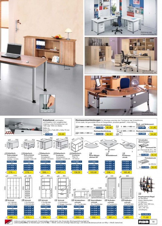 INHALT: Abbildung zeigt lichtgrau/alufarbig .11 2 Seite 85 Abbildung zeigt Ahorn/alufarbig .71 31 32 30 Höhenverstellbar von 680-760 mm Abbildung zeigt Buche/alufarbig .70 Kabelkanal, einhängbar und klappbar, zum waagerechten Unterbau unter Schreibtischen mit 1200 oder 1600 mm Breite. Maße ca: Breite 900 x Tiefe 220 x Höhe 70 mm lichtgrau Nr. 214.0063 Rückwandverkleidungen Zur Montage zwischen den Tischbeinen der Schreibtische, 19 mm stark, mit gerundeter Kante im Designdekor ,,alusilber gestreift", Höhe 400 mm. Rück- und SeitenwandRückwandverkleidung 31 29 B 1600 x H 400 mm B 800 x H 400 mm verkleidung 51,80 Nr. 214.0059 60,80 Nr. 214.0061 Rückwandverkleidung 30 B 1200 x H 400 mm Nr. 214.0060 für 90 53,60 428 56,30 32 B 1200 x H 400 mm Rückwandverkleidung ° Nr. 214.0062 54,50 800 512 428 512 800 428 720-760 änge mit H atur tr regis 800 428 800 720-760 80 720-760 0 40 0 800 800 12 00 änge mit H atur tr regis 800 800 1 200 800 SchubladenEinrichtungen 0 100 800 mit Standbein NebentischContainer Platz für 18 Ordner 214.0020.11 214.0020.70 214.0020.71 214.0020.78 10 Rund-Winkelelement 90° 214.0056.11 214.0056.70 214.0056.71 214.0056.78 11 Winkelelement 12 Konferenzansatz 214.0058.11 214.0058.16 214.0058.70 214.0058.71 214.0058.78 40 0 5 UntertischRollcontainer SchubladenGrößen 1/2/3/3 214.0429.11 214.0429.70 214.0429.71 214.0429.78 6 UntertischRollcontainer SchubladenGrößen 1/2/6 HR 214.0430.11 214.0430.70 214.0430.71 214.0430.78 8 7 NebentischContainer SchubladenGrößen 1/3/3/3/3 214.0314.11 214.0314.70 214.0314.71 214.0314.78 9 NebentischContainer SchubladenGrößen 1/3/3/6 HR 214.0315.11 214.0315.70 214.0315.71 214.0315.78 Trennwand-Set je 4 Trennwände A4 u. A6 2 Trennwände A5 Nr. 214.0064 30,40 Formulareinsatz 214.0057.11 214.0057.16 214.0057.70 214.0057.71 214.0057.78 5x DIN A4 Nr. 214.0065 38,40 278, 1000 278, 420 356, 420 347, 420 139,30 103,60 206, 40 0 163,40 900 420 406 800 800 für Hängeregistratur 500 2004 2004 2004 2004 2004 abschließbar abschließbar abschließbar 400 1200 abschließbar 400 1290 2004 748 825 26 Kugelsegment-Regal für die Wand, Nuten-Stecksystem Ø 1000 mm, größte Tiefe: 200 mm, Fächer innen: 187 x 187 mm schiefergrau Nr. 214.0050.30 abschließbar abschließbar 18 Schrank mit Falttüren 4 Fachböden 214.0037.11 214.0037.70 214.0037.71 214.0037.78 19 Schrank 2 Sichtböden 4 Schubladen 214.0038.11 214.0038.16 214.0038.70 214.0038.71 214.0038.78 20 Schrank 2 Sichtböden unten Türen 214.0040.11 214.0040.70 214.0040.71 214.0040.78 21 Schrank 22 Schiebetüren2 Sichtböden schrank 2 Hänger.-Auszüge 2x 1 Fachboden 214.0042.11 214.0042.70 214.0042.71 214.0042.78 214.0328.11 214.0328.70 214.0328.71 214.0328.78 23 Querrollladenschrank 2x 1 Fachboden 214.0046.11 214.0046.16 214.0046.70 214.0046.71 214.0046.78 24 Rollladenschrank 4 Fachböden 214.0047.11 214.0047.16 214.0047.70 214.0047.71 214.0047.78 25 Rollladenschrank 4 Fachböden 214.0049.11 214.0049.16 214.0049.70 214.0049.71 214.0049.78 466, 315, 324, 554, 250, 332, 391, 493, 71,50 79 Lieferung zerlegt, kartonverpackt. Zusammenbau erfolgt durch den Anwender, Montageanleitung liegt bei. Lieferung frachtfrei, für Bestellungen unter 100, + MwSt. wird eine anteilige Verpackungs- und Versandkostenpauschale von 5, + MwSt. berechnet.
