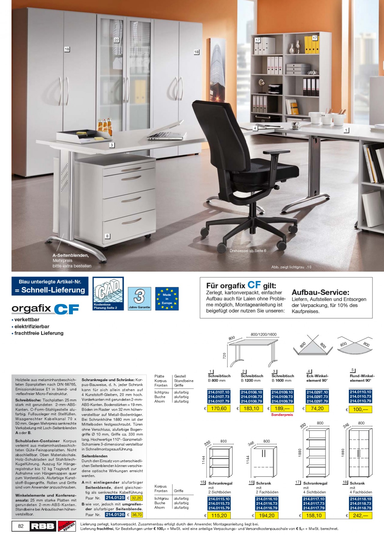 INHALT: 22 1 18 1 18 1 17 1 17 1 4 1 1 1 3 1 8 1 Drehsessel ab Seite 6 A-Seitenblenden, Mehrpreis bitte extra bestellen Abb. zeigt lichtgrau .10 Blau unterlegte Artikel-Nr. = Schnell-Lieferung orgafix CF · verkettbar · elektrifizierbar · frachtfreie Kostenlose Planung Seite 2 Jahre Garantie 3 Für orgafix CF gilt: Made in Europe Zerlegt, kartonverpackt, einfacher Aufbau auch für Laien ohne Probleme möglich, Montageanleitung ist beigefügt oder nutzen Sie unseren: Aufbau-Service: Liefern, Aufstellen und Entsorgen der Verpackung, für 10% des Kaufpreises. Lieferung 800 800/1200/1600 80 800 800 0 0 80 720 Holzteile aus melaminharzbeschichteten Spanplatten nach DIN 68765, Emissionsklasse E1 in blend- und -reflexfreier Micro-Feinstruktur. Schreibtische: Tischplatten 25 mm stark mit gerundeten 2-mm-ABSKanten. C-Form-Stahlgestelle alufarbig. Fußausleger mit Stellfüßen. Waagerechter Kabelkanal 70 x 50 mm. Gegen Mehrpreis senkrechte Verkabelung mit Loch-Seitenblenden A oder B. Schubladen-Container Korpus verleimt aus melaminharzbeschichteten Güte-Feinspanplatten. Nicht abschließbar. Oben Materialschale. Holz-Schubladen auf StahlblechKugelführung. Auszug für Hängeregistratur bis 12 kg Tragkraft zur Aufnahme von Hängemappen quer zum Vorderstück. Alufarbige Kunststoff-Bogengriffe. Rollen und Griffe sind vom Anwender anzuschrauben. Winkelelemente und Konferenzansatz: 25 mm starke Platten mit gerundeten 2-mm-ABS-Kanten. Standbeine bei Anbautischen höhenverstellbar. 1880 Seitenblenden Durch den Einsatz von unterschiedlichen Seitenblenden können verschiedene optische Wirkungen erreicht werden. A mit einliegender alu far biger Seiten blende, dient gleichzeitig als senkrechte Kabelführung Paar Nr. 214.0125 32,20 B wie vor, jedoch mit umgreifender alufarbiger Seitenblende. Paar Nr. 214.0126 36,70 Korpus Fronten lichtgrau Buche Ahorn 1144 1144 15 Griffe alufarbig alufarbig alufarbig Schrankregal mit 2 Sichtböden 214.0115.10 214.0115.73 214.0115.79 16 Schrank mit 2 Fachböden 214.0116.10 214.0116.73 214.0116.79 17 Schrankregal mit 4 Sichtböden 214.0117.10 214.0117.73 214.0117.79 1880 Schrankregale und Schränke: Korpus-Bauweise, d. h. jeder Schrank kann für sich allein stehen auf 4 Kunststoff-Gleitern, 20 mm hoch. Vorderkanten mit gerundeten 2-mmABS-Kanten. Bodenstärken = 19 mm. Böden im Raster von 32 mm höhenverstellbar auf Metall-Bodenträger. Bei Schrankhöhe 1880 mm ist der Mittelboden festgeschraubt. Türen ohne Verschluss, alufarbige Bogengriffe Ø 10 mm, Griffe ca. 330 mm lang. Hochwertige 110°- GanzmetallScharniere 3-dimensional verstellbar in Schnellmontageausführung. Platte Korpus Fronten lichtgrau Buche Ahorn Gestell Standbeine Griffe alufarbig alufarbig alufarbig 1 Schreibtisch B 800 mm 214.0107.10 214.0107.73 214.0107.79 2 Schreibtisch B 1200 mm 214.0108.10 214.0108.73 214.0108.79 3 Schreibtisch B 1600 mm 214.0109.10 214.0109.73 214.0109.79 4 Eck-Winkelelement 90° 214.0297.10 214.0297.73 214.0297.79 5 Rund-Winkelelement 90° 214.0110.10 214.0110.73 214.0110.79 170,60 183,10 189, Sonderpreis 74,20 0 100, 800 33 800 34 6 33 0 800 34 6 800 18 Schrank mit 4 Fachböden 214.0118.10 214.0118.73 214.0118.79 115,20 194,20 158,10 242, 82 Lieferung zerlegt, kartonverpackt. Zusammenbau erfolgt durch den Anwender, Montageanleitung liegt bei. Lieferung frachtfrei, für Bestellungen unter 100, + MwSt. wird eine anteilige Verpackungs- und Versandkostenpauschale von 5, + MwSt. berechnet.