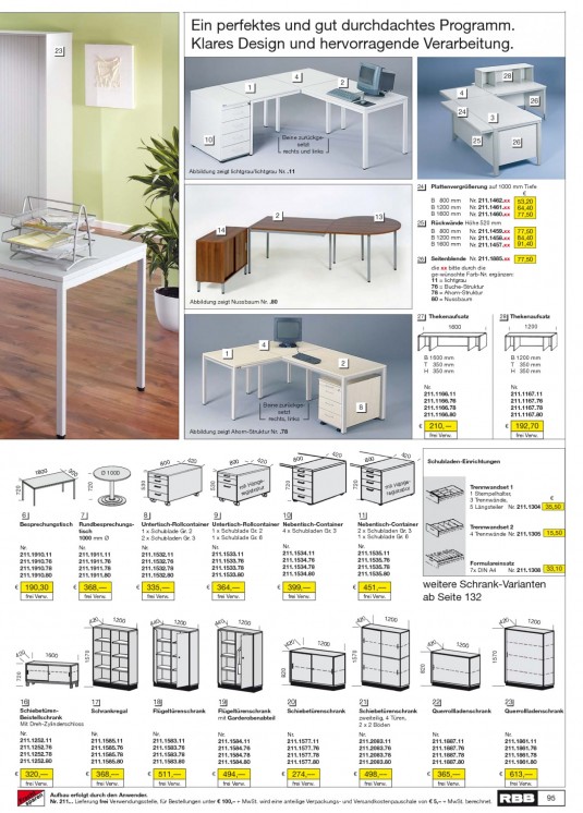 INHALT: 23 1 Ein perfektes und gut durchdachtes Programm. Klares Design und hervorragende Verarbeitung. 4 1 1 1 2 1 4 1 26 1 24 1 3 1 25 1 28 1 10 1 Beine zurückgesetzt rechts und links 26 1 Abbildung zeigt lichtgrau/lichtgrau Nr. .11 24 Plattenvergrößerung auf 1000 mm Tiefe Nr. 211.1462.xx 53,20 Nr. 211.1461.xx 64,40 Nr. 211.1460.xx 77,50 Rückwände Höhe 520 mm Nr. 211.1459.xx 77,50 B 800 mm B 1200 mm Nr. 211.1458.xx 84,40 B 1600 mm Nr. 211.1457.xx 91,40 B 800 mm B 1200 mm B 1600 mm Seitenblende Nr. 211.1885.xx die xx bitte durch die ge-wünschte Farb-Nr. ergänzen: 11 = lichtgrau 76 = Buche-Struktur 78 = Ahorn-Struktur 80 = Nussbaum 27 Thekenaufsatz 1600 28 Thekenaufsatz 1200 2 1 14 1 13 1 25 26 77,50 Abbildung zeigt Nussbaum Nr. .80 4 1 1 1 2 1 B 1600 mm T 350 mm H 350 mm Nr. 211.1166.11 211.1166.76 211.1166.78 211.1166.80 B 1200 mm T 350 mm H 350 mm Nr. 211.1167.11 211.1167.76 211.1167.78 211.1167.80 Beine zurückgesetzt rechts, links Abbildung zeigt Ahorn-Struktur Nr. .78 8 1 210,-- frei Verw. 192,70 frei Verw. 800 1800 420 800 530 420 änge mit H ratur t regis 800 420 800 420 Schubladen-Einrichtungen 90 0 720 Ø 1000 änge mit H atur tr regis 530 720 720 Trennwandset 1 1 Stempelhalter, 3 Trennwände, 5 Längsteiler Nr. 211.1304 35,50 720 6 1 Besprechungstisch 7 1 Rundbesprechungstisch 1000 mm Ø Nr. 211.1911.11 211.1911.76 211.1911.78 211.1911.80 8 1 9 1 10 1 11 1 Nebentisch-Container 2 x Schubladen Gr. 3 1 x Schublade Gr. 6 Nr. 211.1535.11 211.1535.76 211.1535.78 211.1535.80 Trennwandset 2 4 Trennwände Nr. 211.1305 Nr. 211.1910.11 211.1910.76 211.1910.78 211.1910.80 Untertisch-Rollcontainer Untertisch-Rollcontainer Nebentisch-Container 1 x Schublade Gr. 2 4 x Schubladen Gr. 3 1 x Schublade Gr. 2 1 x Schublade Gr. 6 2 x Schubladen Gr. 3 Nr. Nr. Nr. 211.1534.11 211.1533.11 211.1532.11 211.1534.76 211.1533.76 211.1532.76 211.1534.78 211.1533.78 211.1532.78 211.1534.80 211.1533.80 211.1532.80 15,50 Formulareinsatz 7x DIN A4 Nr. 211.1308 33,10 190,30 frei Verw. 368, frei Verw. 335, frei Verw. 364, frei Verw. 399, frei Verw. 451, frei Verw. weitere Schrank-Varianten ab Seite 132 420 1200 420 1200 440 1200 440 1200 420 1200 420 1570 1200 420 1570 1200 0 42 720 1600 16 1 SchiebetürenBeistellschrank Mit Dreh-Zylinderschloss Nr. 211.1252.11 211.1252.76 211.1252.78 211.1252.80 17 1 Schrankregal 18 1 Flügeltürenschrank 19 1 Flügeltürenschrank mit Garderobenabteil Nr. 211.1584.11 211.1584.76 211.1584.78 211.1584.80 820 20 1 Schiebetürenschrank 21 1 Schiebetürenschrank zweiteilig, 4 Türen, 2 x 2 Böden Nr. 211.2083.11 211.2083.76 211.2083.78 211.2083.80 820 22 1 Querrollladenschrank 1570 23 1 Querrollladenschrank Nr. 211.1585.11 211.1585.76 211.1585.78 211.1585.80 Nr. 211.1583.11 211.1583.76 211.1583.78 211.1583.80 Nr. 211.1577.11 211.1577.76 211.1577.78 211.1577.80 Nr. 211.1887.11 211.1887.76 211.1887.78 211.1887.80 Nr. 211.1861.11 211.1861.76 211.1861.78 211.1861.80 320, frei Verw. 368, frei Verw. 511, frei Verw. 494, frei Verw. 274, frei Verw. 498, frei Verw. 365, frei Verw. 613, frei Verw. Aufbau erfolgt durch den Anwender. Nr. 211... Lieferung frei Verwendungsstelle, für Bestellungen unter 100, + MwSt. wird eine anteilige Verpackungs- und Versandkostenpauschale von 5, + MwSt. berechnet. 95