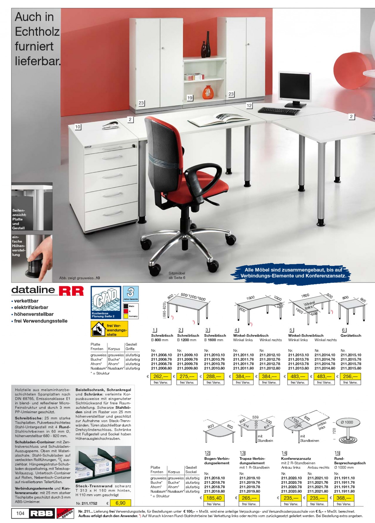 INHALT: Auch in Echtholz furniert lieferbar. 19 1 23 1 23 1 12 1 2 1 2 1 10 1 Seitenansicht: Platte und Gestell einfache Höhenverstellung Abb. zeigt grauweiss .10 Sitzmöbel ab Seite 6 Alle Möbel sind zusammengebaut, bis auf Verbindungs-Elemente und Konferenzansatz. dataline RR · verkettbar · elektrifizierbar · höhenverstellbar · frei Kostenlose Planung Seite 2 Jahre Garantie 3 in 80 680-820 0 800/1 200/1 600 1600 100 0 16 1800 el Wink links 80 0 800 60 0 Made 800 1 420 00 Germany Verwendungsstelle frei Verwendungsstelle Platte Fronten Gestell Griffe alufarbig alufarbig alufarbig alufarbig ) 1 1 600 1 ) )) 1 ) 1 1 Schreibtisch B 800 mm Nr. 211.2008.10 211.2008.76 211.2008.78 211.2008.80 2 1 Schreibtisch B 1200 mm Nr. 211.2009.10 211.2009.76 211.2009.78 211.2009.80 3 1 Schreibtisch B 1600 mm Nr. 211.2010.10 211.2010.76 211.2010.78 211.2010.80 4 1 Winkel-Schreibtisch Winkel links Winkel rechts Nr. 211.2011.10 211.2011.76 211.2011.78 211.2011.80 Nr. 211.2012.10 211.2012.76 211.2012.78 211.2012.80 5 1 Winkel-Schreibtisch Winkel links Winkel rechts Nr. 211.2013.10 211.2013.76 211.2013.78 211.2013.80 Nr. 211.2014.10 211.2014.76 211.2014.78 211.2014.80 6 1 Gerätetisch Korpus grauweiss grauweiss Buche* Buche* Ahorn* Ahorn* Nussbaum* Nussbaum* * = Struktur Nr. 211.2015.10 211.2015.76 211.2015.78 211.2015.80 262, frei Verw. 275, frei Verw. 288, frei Verw. 384, frei Verw. 384, frei Verw. 483, frei Verw. 483, frei Verw. 256, frei Verw. Holzteile aus melaminharzbeschichteten Spanplatten nach DIN 68765, Emissionsklasse E1 in blend- und reflexfreier MicroFeinstruktur und durch 3 mm PP-Umleimer geschützt. Schreibtische: 25 mm starke Tischplatten. Pulverbeschichtetes Stahl-Untergestell mit 4 RundStahlrohrbeinen in 60 mm Ø, höhenverstellbar 680 - 820 mm. Schubladen-Container: mit Zentralverschluss und SchubladenAuszugsperre. Oben mit Materialschale. Stahl-Schubladen auf verdeckten Rollführungen, 4/5 ausziehbar. Hängeregistratur-Schubladen doppelbahnig, mit TeleskopVollauszug. Untertisch-Container auf Rollen, Nebentisch-Container auf nivellierbaren Tellerfüßen. Verbindungselemente und Konferenzansatz: mit 25 mm starker Tischplatte geschützt durch 3 mm ABS-Umleimer. Beistellschrank, Schrankregal und Schränke: verleimte Korpusbauweise mit eingenuteter Sichtrückwand für freie Raumaufstellung. Schwarze Stahlböden sind im Raster von 25 mm höhenverstellbar und geschlitzt zur Aufnahme von Steck-Trennwänden. Türen abschließbar durch Drehzylinderschloss. Schränke mit Fußgestell und Sockel haben Höhenausgleichschrauben. 1000 mit Standbein mit Standbeinen 12 1 Bogen-Verbindungselement Platte Fronten Korpus Gestell Sockel alufarbig alufarbig alufarbig alufarbig Nr. 211.2018.10 211.2018.76 211.2018.78 211.2018.80 13 1 Trapez-Verbindungselement mit 1 R-Standbein Nr. 211.2019.10 211.2019.76 211.2019.78 211.2019.80 14 1 Konferenzansatz mit 2 R-Standbeinen Anbau links Anbau rechts Nr. 211.2020.10 211.2020.76 211.2020.78 211.2020.80 Nr. 211.2021.10 211.2021.76 211.2021.78 211.2021.80 S t e c k - Tre n n w a n d s c h w a r z T 313 x H 160 mm hinten, H 110 mm vorn geschrägt Nr. 211.1752 grauweiss grauweiss Buche* Buche* Ahorn* Ahorn* Nussbaum* Nussbaum* * = Struktur 185,40 frei Verw. 265, frei Verw. 235, frei Verw. 235, frei Verw. 720 800 800 80 0 559 614 800 4 61 11 00 0 104 80 0 au Anb s link Ø 1000 15 1 RundBesprechungstisch Ø 1000 mm Nr. 211.1911.10 211.1911.76 211.1911.78 211.1911.80 368, frei Verw. 6,90 104 Nr. 211... Lieferung frei Verwendungsstelle, für Bestellungen unter 100, + MwSt. wird eine anteilige Verpackungs- und Versandkostenpauschale von 5, + MwSt. berechnet. Aufbau erfolgt durch den Anwender. 1) Auf Wunsch können Rund-Stahlrohrbeine bei Verkettung links oder rechts vorn zurückgesetzt geliefert werden. Bei Bestellung extra angeben.