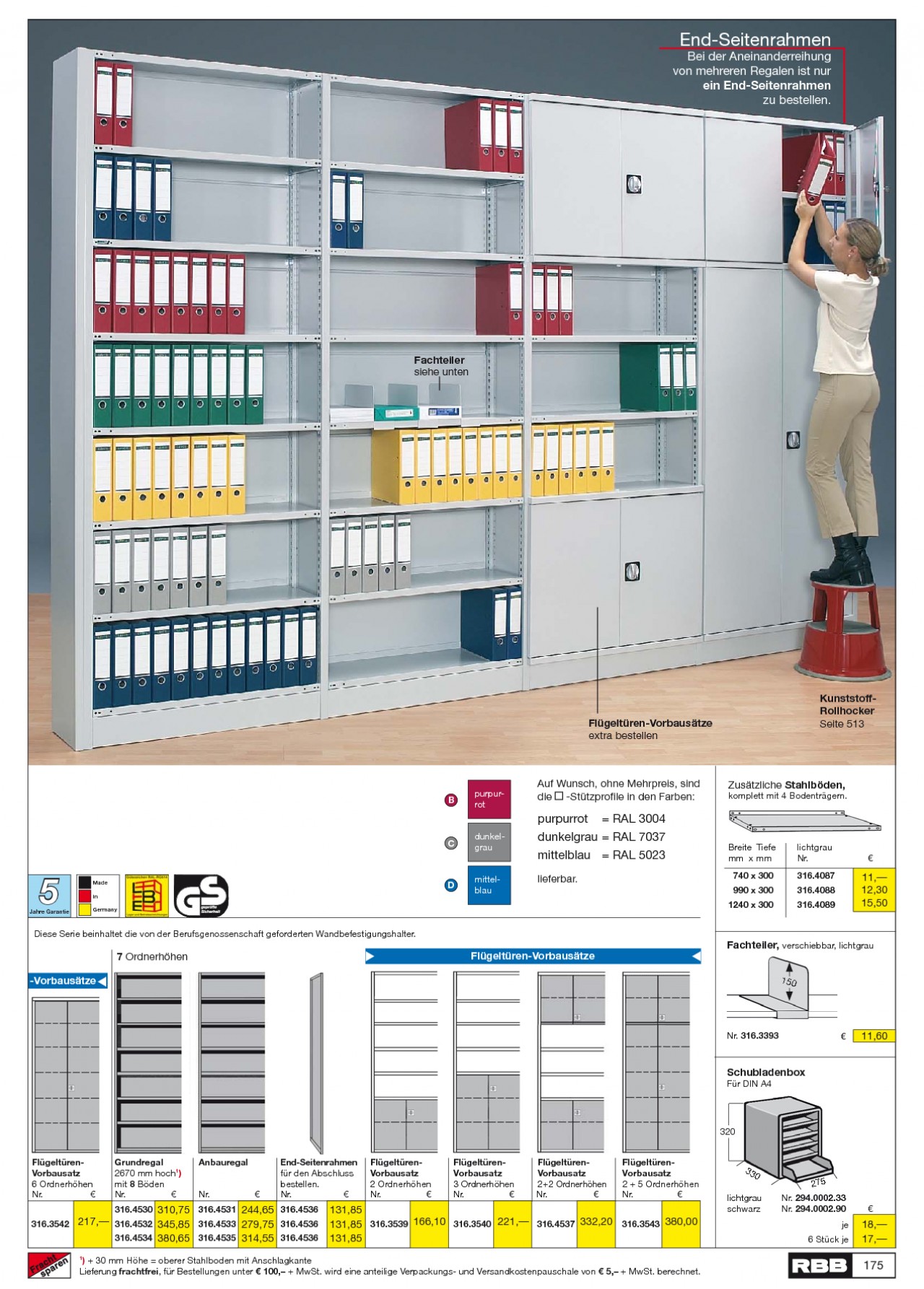 INHALT: End-Seitenrahmen Bei der Aneinanderreihung von mehreren Regalen ist nur ein End-Seitenrahmen zu bestellen. Fachteiler siehe unten Flügeltüren-Vorbausätze extra bestellen KunststoffRollhocker Seite 513 B purpurrot Auf Wunsch, ohne Mehrpreis, sind die -Stützprofile in den Farben: Zusätzliche Stahlböden, komplett mit 4 Bodenträgern. C dunkelgrau purpurrot = RAL 3004 dunkelgrau = RAL 7037 mittelblau = RAL 5023 lieferbar. Breite Tiefe mm x mm 740 x 300 990 x 300 1240 x 300 lichtgrau Nr. 316.4087 316.4088 316.4089 Jahre Garantie 5 Made in Germany D mittelblau 11, 12,30 15,50 Diese Serie beinhaltet die von der Berufsgenossenschaft geforderten Wandbefestigungshalter. Fachteiler, verschiebbar, lichtgrau 7 Ordnerhöhen -Vorbausätze Flügeltüren-Vorbausätze 150 Nr. 316.3393 11,60 Schubladenbox Für DIN A4 320 FlügeltürenVorbausatz 6 Ordnerhöhen Nr. Grundregal 2670 mm hoch1) mit 8 Böden Nr. Anbauregal End-Seitenrahmen für den Abschluss bestellen. Nr. FlügeltürenVorbausatz 2 Ordnerhöhen Nr. FlügeltürenVorbausatz 3 Ordnerhöhen Nr. FlügeltürenVorbausatz 2+2 Ordnerhöhen Nr. FlügeltürenVorbausatz 2 + 5 Ordnerhöhen Nr. 33 0 Nr. 316.4530 310,75 316.4531 244,65 316.4536 316.3542 217, 316.4532 345,85 316.4533 279,75 316.4536 316.4534 380,65 316.4535 314,55 316.4536 1 131,85 131,85 316.3539 166,10 316.3540 221, 316.4537 332,20 316.3543 380,00 131,85 lichtgrau schwarz 275 Nr. 294.0002.33 Nr. 294.0002.90 je 6 Stück je 18, 17, ) + 30 mm Höhe = oberer Stahlboden mit Anschlagkante Lieferung frachtfrei, für Bestellungen unter 100, + MwSt. wird eine anteilige Verpackungs- und Versandkostenpauschale von 5, + MwSt. berechnet. 175