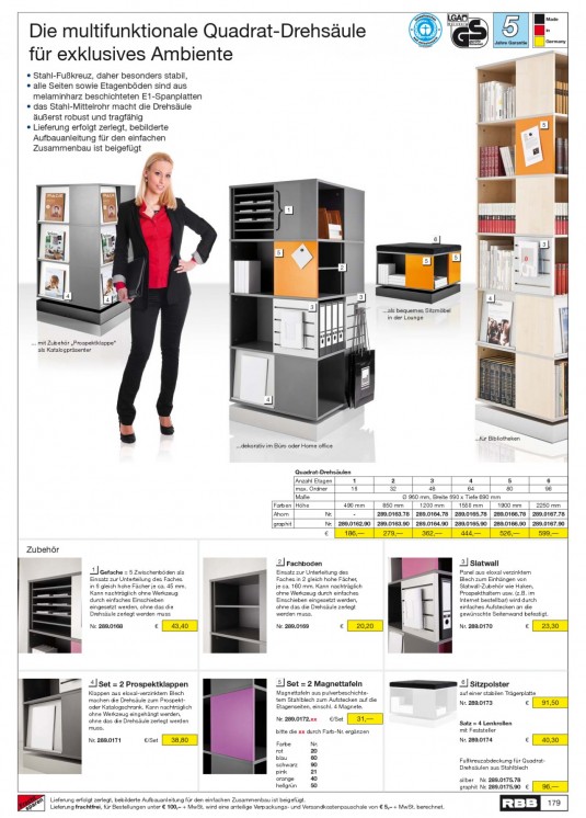 INHALT: Die multifunktionale Quadrat-Drehsäule für exklusives Ambiente · Stahl-Fußkreuz, daher besonders stabil, · alle Seiten sowie Etagenböden sind aus melaminharz beschichteten E1-Spanplatten · das Stahl-Mittelrohr macht die Drehsäule äußerst robust und tragfähig · Lieferung erfolgt zerlegt, bebilderte Aufbauanleitung für den einfachen Zusammenbau ist beigefügt Jahre Garantie 5 Made in Germany 5 1 1 1 6 1 5 1 2 1 5 1 5 1 3 1 4 1 4 1 3 1 3 1 ...als bequemes Sitzmöbel in der Lounge 4 1 ... mit Zubehör ,,Prospektklappe" als Katalogpräsenter 4 4 ...für Bibliotheken ...dekorativ im Büro oder Home office Quadrat-Drehsäulen Anzahl Etagen max. Ordner Maße Farben Höhe Ahorn graphit Nr. Nr. 1 16 490 mm 289.0162.90 3 4 5 48 64 80 Ø 960 mm, Breite 690 x Tiefe 690 mm 850 mm 1200 mm 1550 mm 1900 mm 289.0163.78 289.0163.90 289.0164.78 289.0164.90 289.0165.78 289.0165.90 289.0166.78 289.0166.90 2 32 6 96 2250 mm 289.0167.78 289.0167.90 186, 279, 362, 444, 526, 599, Zubehör 1 Gefache = 5 Zwischenböden als 1 Einsatz zur Unterteilung des Faches in 6 gleich hohe Fächer je ca. 45 mm. Kann nachträglich ohne Werkzeug durch einfaches Einschieben eingesetzt werden, ohne das die Drehsäule zerlegt werden muss Nr. 289.0168 2 Fachboden 1 Einsatz zur Unterleitung des Faches in 2 gleich hohe Fächer, je ca. 160 mm. Kann nachträglich ohne Werkzeug durch einfaches Einschieben eingesetzt werden, ohne das die Drehsäule zerlegt werden muss. Nr. 289.0169 3 1 Slatwall Panel aus eloxal verzinktem Blech zum Einhängen von Slatwall-Zubehör wie Haken, Prospekthaltern usw. (z.B. im Internet bestellbar) wird durch einfaches Aufstecken an die gewünschte Seitenwand befestigt. Nr. 289.0170 43,40 20,20 23,30 4 1 Set = 2 Prospektklappen 5 1 Set = 2 Magnettafeln 6 1 Sitzpolster Klappen aus eloxal-verzinktem Blech machen die Drehsäule zum Prospektoder Katalogschrank. Kann nachträglich ohne Werkzeug eingehängt werden, ohne das die Drehsäule zerlegt werden muss. Nr. 289.0171 /Set Magnettafeln aus pulverbeschichtetem Stahlblech zum Aufstecken auf die Etagenseiten, einschl. 4 Magnete. Nr. 289.0172.xx /Set auf einer stabilen Trägerplatte Nr. 289.0173 91,50 31, bitte die xx durch Farb-Nr. ergänzen Farbe rot blau schwarz pink orange hellgrün Nr. 20 60 90 21 40 50 Satz = 4 Lenkrollen mit Feststeller Nr. 289.0174 38,80 40,30 Fußkreuzabdeckung für QuadratDrehsäulen aus Stahlblech silber Nr. 289.0175.78 graphit Nr. 289.0175.90 96, Lieferung erfolgt zerlegt, bebilderte Aufbauanleitung für den einfachen Zusammenbau ist beigefügt. Lieferung frachtfrei, für Bestellungen unter 100, + MwSt. wird eine anteilige Verpackungs- und Versandkostenpauschale von 5, + MwSt. berechnet. 179