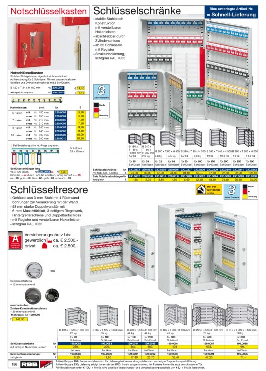 INHALT: Notschlüsselkasten Schlüsselschränke · stabile Blau unterlegte Artikel-Nr. StahlblechKonstruktion mit verstellbaren Hakenleisten · abschließbar durch Zylinderschloss · ab 32 Schlüsseln mit Register · Strukturlackierung, lichtgrau RAL 7035 = Schnell-Lieferung Notschlüsselkasten Stabiles Stahlgehäuse, signalrot einbrennlackiert. Aufbewahrung für 2 Schlüssel. Tür mit auswechselbarer Scheibe und Drehzylinderschloss mit 2 Schlüsseln. B 120 x T 34 x H 150 mm Klöppel-Mehrpreis Nr. 230.0001 Nr. 230.0002 14,80 7,10 Jahre Garantie 3 in Made Hakenleisten 5 Haken 7 Haken 8 Haken 10 Haken mit ohne mit ohne mit ohne mit ohne Nr. Nr. Nr. Nr. Nr. Nr. Nr. Nr. breit 150 mm 150 mm 210 mm 210 mm 240 mm 240 mm 300 mm 300 mm Nr. 230.0003 1) 230.0004 230.0005 1) 230.0006 230.0007 1) 230.0008 230.0009 1) 230.0010 5,70 5,70 7,50 7,50 9,40 9,40 10,90 10,90 Germany 1 ) Bei Bestellung bitte Nr.-Folge angeben. Schriftfeld 33 x 15 mm B 180 x T 80 x H 250 mm 1,3 kg B 240 x T 80 x B 300 x T 80 x H 450 B 380 x T 80 x H 550 B 380 x T140 x H 550 B 380 x T 205 x H 550 H 300 mm 5,0 kg 10 kg 10,5 kg 14 kg 14,5 kg 2,0 kg 4,0 kg 4,5 kg 6,0 kg für 15 für 28 für 32 für 64 für 50 für 100 für 150 für 200 für 250 für 300 Schlüssel Schlüssel Schlüssel Schlüssel Schlüssel Schlüssel Schlüssel Schlüssel Schlüssel Schlüssel Schlüsselanhänger lang VE = 100 Stück. Nr. 228.0012.xx 5,30 Bitte die ....xx durch Farb-Nr. ersetzen, farbig sortiert = ....00 rot...20, grün...50, blau...60, gelb...70, schwarz....90 Schlüsselschränke Nr. 230.0203 230.0533 230.0205 230.0206 230.0207 230.0208 230.0209 230.0210 230.0211 230.0212 mit farb. Nrn.-Leisten 102,10 25,20 30,90 42,20 44,80 49,10 52, 67,70 72,80 92,90 Satz Schlüsselanhänger Nr. 230.0012 230.0534 230.0016 230.0018 230.0020 230.0022 230.0024 230.0026 230.0028 230.0030 farbgleich 1,85 2,95 3,80 7,60 5,90 12,10 18,10 24,10 30,10 35,90 Schlüsseltresore · Gehäuse frei Verwendungsstelle aus 3-mm-Stahl mit 4 Rückwandbohrungen zur Verankerung mit der Wand · 58 mm starke Doppelwandtür mit 6-mm-Massivtürblatt, 3-seitigem Riegelwerk, Hintergreiferschiene und Doppelbartschloss · mit Register und verstellbaren Hakenleisten · lichtgrau RAL 7035 Jahre Garantie 3 Made in Germany Sicherheitsstufe nach VDMA 24992 (Stand: Mai 1995) A Versicherungschutz bis: gewerblich ca. 2.500,privat ca. 2.500,- Serienausstattung + 12 mm vorstehend mechanisches Zahlen-Kombinationsschloss + 30 mm vorstehend Mehrpreis: Nr. 199.0096 142,50 B 459 x T 120 x H 436 mm 22 kg für 70 Schlüssel 199.0082 B 460 x T 120 x H 636 mm 35 kg für 100 Schlüssel 199.0083 B 460 x T 206 x H 636 mm 44 kg 44 kg für 150 Schlüssel 199.0084 für 200 Schlüssel 199.0085 B 460 x T 306 x H 636 mm 48 kg für 300 Schlüssel 199.0086 B 812 x T 206 x H 636 mm 70 kg für 400 Schlüssel 199.0087 B 812 x T 306 x H 636 mm 80 kg für 600 Schlüssel 199.0088 Schlüsselschränke mit farbigen Nummern-Leisten Satz Schlüsselanhänger farbgleich Nr. 268, frei Verw. 199.0089 299, frei Verw. 199.0090 357, frei Verw. 199.0091 382, frei Verw. 199.0092 428, frei Verw. 199.0093 638, frei Verw. 199.0094 791, frei Verw. 199.0095 186 Nr. 8,20 11,90 17,90 23,70 35,40 47,20 Artikel-Gruppe 199: Preise verstehen sich für Lieferung frei Verwendungsstelle nach vorheriger Treppentransport-Klärung Artikel-Gruppe 230: Lieferung erfolgt innerhalb der BRD, Inseln ausgenommen, frei Parterre hinter die erste verschlossene Tür. Für Bestellungen unter 100,- + MwSt. wird anteilige Verpackungs- und Versandkostenpauschale von 5,- + MwSt. berechnet. 71,