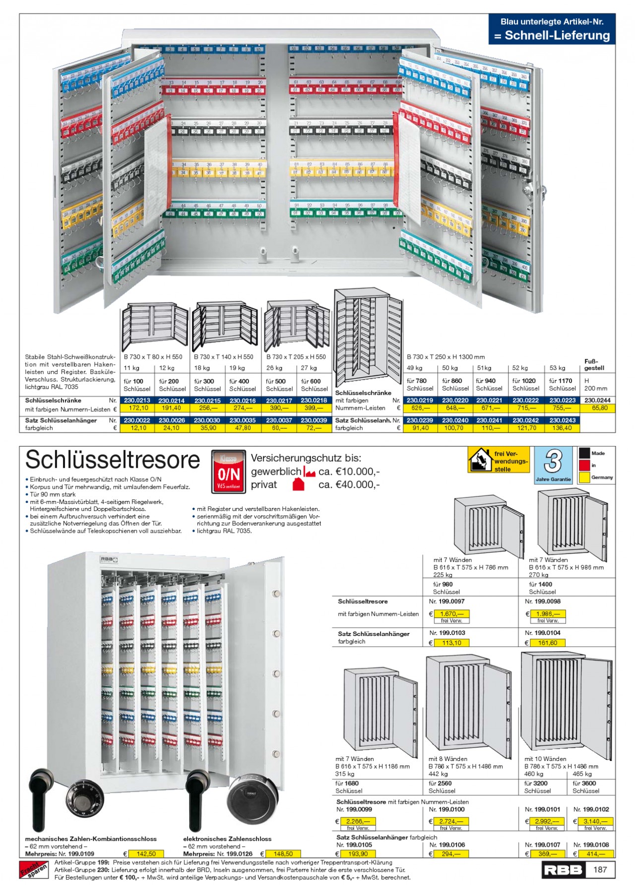 INHALT: Blau unterlegte Artikel-Nr. = Schnell-Lieferung Stabile Stahl-Schweißkonstruktion mit verstellbaren Hakenleisten und Register. BasküleVerschluss. Strukturlackierung, lichtgrau RAL 7035 Schlüsselschränke Nr. mit farbigen Nummern-Leisten Satz Schlüsselanhänger farbgleich Nr. B 730 x T 80 x H 550 11 kg für 100 Schlüssel 230.0213 172,10 230.0022 12,10 12 kg für 200 Schlüssel 230.0214 191,40 230.0026 24,10 B 730 x T 140 x H 550 18 kg für 300 Schlüssel 230.0215 256, 230.0030 35,90 19 kg für 400 Schlüssel 230.0216 274, 230.0035 47,80 B 730 x T 205 x H 550 26 kg für 500 Schlüssel 230.0217 390, 230.0037 60, 27 kg für 600 Schlüssel 230.0218 399, 230.0039 72, B 730 x T 250 x H 1300 mm 49 kg für 780 Schlüssel 230.0219 626, 230.0239 91,40 50 kg für 860 Schlüssel 230.0220 648, 230.0240 100,70 51kg für 940 Schlüssel 230.0221 671, 230.0241 110, 52 kg für 1020 Schlüssel 230.0222 715, 230.0242 121,70 53 kg für 1170 Schlüssel 230.0223 755, 230.0243 136,40 Fußgestell H 200 mm 230.0244 65,80 Schlüsselschränke mit farbigen Nr. Nummern-Leisten Satz Schlüsselanh. Nr. farbgleich Schlüsseltresore Klasse · Einbruch- und feuergeschützt nach Klasse O/N VdS zertifiziert · Korpus und Tür mehrwandig, mit umlaufendem Feuerfalz. · Tür 90 mm stark · mit 6-mm-Massivtürblatt, 4-seitigem Riegelwerk, · mit Register und verstellbaren Hakenleisten. Hintergreifschiene und Doppelbartschloss. · bei einem Aufbruchversuch verhindert eine · serienmäßig mit der vorschriftsmäßigen Vorzusätzliche Notverriegelung das Öffnen der Tür. richtung zur Bodenverankerung ausgestattet · Schlüsselwände auf Teleskopschienen voll ausziehbar. · lichtgrau RAL 7035. 0/N Versicherungschutz bis: gewerblich ca. 10.000,privat ca. 40.000,- frei Verwendungsstelle Jahre Garantie 3 Made in Germany mit 7 Wänden B 616 x T 575 x H 786 mm 225 kg für 980 Schlüssel Schlüsseltresore mit farbigen Nummern-Leisten Satz Schlüsselanhänger farbgleich Nr. 199.0097 mit 7 Wänden B 616 x T 575 x H 986 mm 270 kg für 1400 Schlüssel Nr. 199.0098 1.670, frei Verw. 1.986, frei Verw. Nr. 199.0103 Nr. 199.0104 113,10 161,60 mit 7 Wänden B 616 x T 575 x H 1186 mm 315 kg für 1680 Schlüssel mit 8 Wänden B 786 x T 575 x H 1486 mm 442 kg für 2560 Schlüssel mit 10 Wänden B 786 x T 575 x H 1486 mm 460 kg 465 kg für 3600 für 3200 Schlüssel Schlüssel Nr. 199.0101 Nr. 199.0102 Schlüsseltresore mit farbigen Nummern-Leisten Nr. 199.0099 Nr. 199.0100 2.266, frei Verw. 2.724, frei Verw. 2.992, frei Verw. 3.140, frei Verw. Satz Schlüsselanhänger farbgleich mechanisches Zahlen-Kombiantionsschloss elektronisches Zahlenschloss Nr. 199.0105 Nr. 199.0106 62 mm vorstehend 62 mm vorstehend Mehrpreis: Nr. 199.0109 Mehrpreis: Nr. 199.0126 148,50 142,50 193,90 294, Artikel-Gruppe 199: Preise verstehen sich für Lieferung frei Verwendungsstelle nach vorheriger Treppentransport-Klärung Artikel-Gruppe 230: Lieferung erfolgt innerhalb der BRD, Inseln ausgenommen, frei Parterre hinter die erste verschlossene Tür. Für Bestellungen unter 100,- + MwSt. wird anteilige Verpackungs- und Versandkostenpauschale von 5,- + MwSt. berechnet. Nr. 199.0107 369, 0.000,-- Nr. 199.0108 414, 187