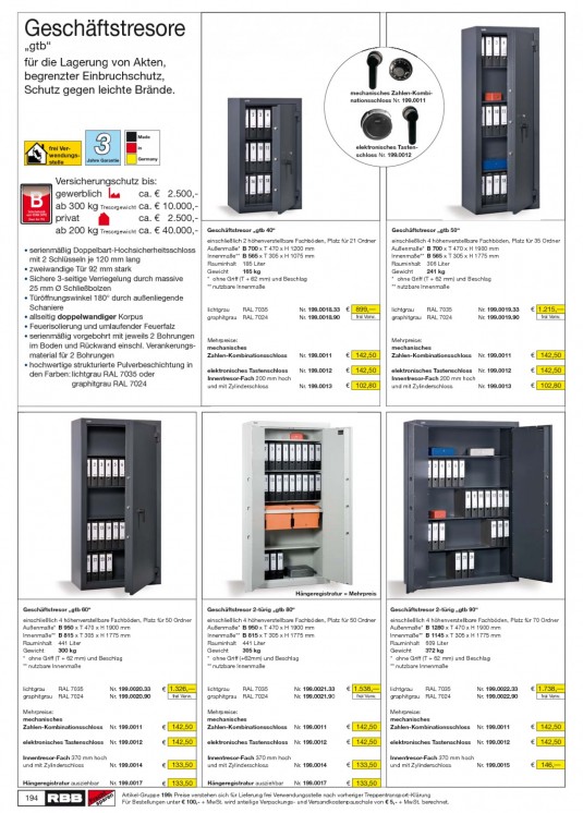 INHALT: Geschäftstresore ,,gtb" für die Lagerung von Akten, begrenzter Einbruchschutz, Schutz gegen leichte Brände. mechanisches Zahlen-Kombinationsschloss Nr. 199.0011 frei Verwendungsstelle Jahre Garantie 3 Made in Germany elektronisches Tastenschloss Nr. 199.0012 Sicherheitsstufe nach VDMA 24992 (Stand: Mai 1995) B Versicherungschutz bis: gewerblich ca. ab 300 kg Tresorgewicht ca. privat ca. ab 200 kg Tresorgewicht ca. 2.500,10.000,2.500,40.000,- Geschäftstresor ,,gtb 40" einschließlich 2 höhenverstellbare Fachböden, Platz für 21 Ordner Außenmaße* B 700 x T 470 x H 1200 mm Innenmaße** B 565 x T 305 x H 1075 mm Rauminhalt 185 Liter Gewicht 165 kg * ohne Griff (T + 62 mm) und Beschlag ** nutzbare Innenmaße Geschäftstresor ,,gtb 50" einschließlich 4 höhenverstellbare Fachböden, Platz für 35 Ordner Außenmaße* B 700 x T 470 x H 1900 mm Innenmaße** B 565 x T 305 x H 1775 mm Rauminhalt 306 Liter Gewicht 241 kg * ohne Griff (T + 62 mm) und Beschlag ** nutzbare Innenmaße · serienmäßig Doppelbart-Hochsicherheitsschloss mit 2 Schlüsseln je 120 mm lang · zweiwandige Tür 92 mm stark · Sichere 3-seitige Verriegelung durch massive 25 mm Ø Schließbolzen · Türöffnungswinkel 180° durch außenliegende Schaniere · allseitig doppelwandiger Korpus · Feuerisolierung und umlaufender Feuerfalz · serienmäßig vorgebohrt mit jeweils 2 Bohrungen lichtgrau graphitgrau RAL 7035 RAL 7024 Nr. 199.0018.33 Nr. 199.0018.90 899, frei Verw. lichtgrau graphitgrau RAL 7035 RAL 7024 Nr. 199.0019.33 Nr. 199.0019.90 1.215, frei Verw. im Boden und Rückwand einschl. Verankerungsmaterial für 2 Bohrungen · hochwertige strukturierte Pulverbeschichtung in den Farben: lichtgrau RAL 7035 oder graphitgrau RAL 7024 Mehrpreise: mechanisches Zahlen-Kombinationsschloss elektronisches Tastenschloss Innentresor-Fach 200 mm hoch und mit Zylinderschloss Nr. 199.0011 Nr. 199.0012 Nr. 199.0013 142,50 142,50 102,80 Mehrpreise: mechanisches Zahlen-Kombinationsschloss Nr. 199.0011 142,50 142,50 102,80 elektronisches Tastenschloss Nr. 199.0012 Innentresor-Fach 200 mm hoch und mit Zylinderschloss Nr. 199.0013 Hängeregistratur = Mehrpreis Geschäftstresor ,,gtb 60" einschließlich 4 höhenverstellbare Fachböden, Platz für 50 Ordner Außenmaße* B 950 x T 470 x H 1900 mm Innenmaße** B 815 x T 305 x H 1775 mm Rauminhalt 441 Liter Gewicht 300 kg * ohne Griff (T + 62 mm) und Beschlag ** nutzbare Innenmaße Geschäftstresor 2-türig ,,gtb 80" einschließlich 4 höhenverstellbare Fachböden, Platz für 50 Ordner Außenmaße* B 950 x T 470 x H 1900 mm Innenmaße** B 815 x T 305 x H 1775 mm Rauminhalt 441 Liter Gewicht 305 kg * ohne Griff (+62mm) und Beschlag ** nutzbare Innenmaße Geschäftstresor 2-türig ,,gtb 90" einschließlich 4 höhenverstellbare Fachböden, Platz für 70 Ordner Außenmaße* B 1280 x T 470 x H 1900 mm Innenmaße** B 1145 x T 305 x H 1775 mm Rauminhalt 609 Liter Gewicht 372 kg * ohne Griff (T + 62 mm) und Beschlag ** nutzbare Innenmaße lichtgrau graphitgrau RAL 7035 RAL 7024 Nr. 199.0020.33 Nr. 199.0020.90 1.326, frei Verw. lichtgrau graphitgrau RAL 7035 RAL 7024 Nr. 199.0021.33 Nr. 199.0021.90 1.538, frei Verw. lichtgrau graphitgrau RAL 7035 RAL 7024 Nr. 199.0022.33 Nr. 199.0022.90 1.738, frei Verw. Mehrpreise: mechanisches Zahlen-Kombinationsschloss elektronisches Tastenschloss Nr. 199.0011 Nr. 199.0012 142,50 142,50 133,50 133,50 Mehrpreise: mechanisches Zahlen-Kombinationsschloss elektronisches Tastenschloss Nr. 199.0011 .0011 Nr. 199.0012 1 142,50 Mehrpreise: mechanisches Zahlen-Kombinationsschloss elektronisches Tastenschloss Nr. 199.0011 Nr. 199.0012 142,50 142,50 146, 142,50 133,50 133,50 Innentresor-Fach 370 mm hoch und mit Zylinderschloss Nr. 199.0014 Hängeregistratur ausziehbar Nr. 199.0017 Innentresor-Fach 370 mm hoch und mit Zylinderschloss Nr. 199.0014 Hängeregistratur ausziehbar Nr. 199.0017 Innentresor-Fach 370 mm hoch und mit Zylinderschloss Nr. 199.0015 194 Artikel-Gruppe 199: Preise verstehen sich für Lieferung frei Verwendungsstelle nach vorheriger Treppentransport-Klärung Für Bestellungen unter 100,- + MwSt. wird anteilige Verpackungs- und Versandkostenpauschale von 5,- + MwSt. berechnet.