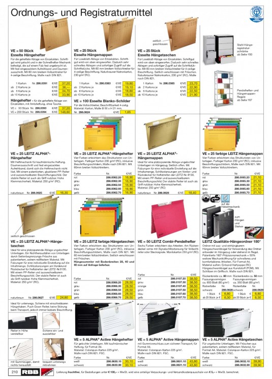 INHALT: Ordnungs- und Registraturmittel seitlich geschlossen VE = 50 Stück Esselte Hängehefter Für die geheftete Ablage von Einzelakten. Schriftgut wird gelocht und in der Schnellhefter-Mechanik befestigt, die auf einem Falz fest angebracht ist. Mit fest eingezacktem Aufreihband und Daumenausschnitt. Mit 60 mm breitem Vollsichtreiter für 4-zeilige Beschriftung. Maße nach DIN 821. 1 Karton Nr. 286.0391 ab 2 Kartons je ab 6 Kartons je ab 10 Kartons je /VE /VE /VE /VE VE = 25 Stück Esselte Hängemappen Für Loseblatt-Ablage von Einzelakten. Schriftgut wird von oben eingeworfen. Dadurch sehr schnelles Ablegen und sofortiger Zugriff auf die Schriftstücke. Mit 60 mm breitem Vollsichtreiter für 4-zeilige Beschriftung. Naturbrauner Natronkarton, 230 g/m2 (RC). 1 Karton Nr. 286.0383 ab 2 Kartons je ab 6 Kartons je ab 10 Kartons je /VE /VE /VE /VE VE = 25 Stück Esselte Hängetaschen Für Loseblatt-Ablage von Einzelakten. Schriftgut wird von oben eingeworfen. Dadurch sehr schnelles Ablegen und sofortiger Zugriff auf die Schriftstükke. Mit 60 mm breitem Vollsichtreiter für 4-zeilige Beschriftung. Seitlich verschlossen mit Fröschen. Naturbrauner Natronkarton, 230 g/m2 (RC). Maße nach DIN 821. 1 Karton Nr. 286.0385 ab 2 Kartons je ab 6 Kartons je ab 10 Kartons je /VE /VE /VE /VE Stahl-Hängeregistraturschränke ab Seite 150 37,20 36, 34,70 33,90 19,80 19,10 18,80 18,50 23,70 22,90 22,50 21,90 Hängehefter für die geheftete Ablage von Einzelakten, mit Amtsheftung, ohne Tasche. VE = 50 Stück Nr. 286.0393 VE = 200 Stück Nr. 286.0394 /VE /VE VE = 100 Esselte Blanko-Schilder Für die Vollsichtreiter, Beschriftbarkeit 4-zelig. Material: Karton, Maße B 60 x H 21 mm. 1,65 Nr. 286.0624 /VE Pendelhefter- und HängemappenRegale ab Seite 167 37,20 148,80 VE = 25 LEITZ ALPHA®Hängehefter Mit Heftmechanik für kaufmännische Heftung. Daumenausschnitt und fest eingezacktes Aufreihband, damit sich die Heftmechanik nicht löst. Mit einem patentierten, glasklaren PP-Reiter und auswechselbaren Beschriftungsschild. Der stabile Reiter ist auch als Griff nutzbar. Hohe Klemmsicherheit. Material: 250 g/m2 (RC). VE = 25 LEITZ ALPHA®-Hängehefter Vier Farben erleichtern das Strukturieren von Unterlagen. Farbiger Karton 230 g/m2 (RC), inklusive Beschriftungsschildern, Maße nach DIN 821. Mit 60mm breiten Vollsichtreitern. Farbe rot grau grün blau gelb Nr. 286.0062.20 286.0062.30 286.0062.50 286.0062.60 286.0062.70 /VE VE = 25 LEITZ ALPHA®Hängemappen Ideal für eine platzsparende Ablage ungelochter Unterlagen im Hängezug. Seitlich offen. Mit Falzungen für eine individuelle Einstellung auf die Inhaltsmenge. Schlitzstanzungen am Vorder- und Rückdeckel für Heftstreifen der LEITZ-Nr. 6130. Mit einem PP-Reiter und auswechselbarem Beschriftungsschild. Der stabile Reiter ist auch als Griff nutzbar. Hohe Klemmsicherheit. Material: 250 g/m2 (RC) naturbraun Nr. 286.0626 /VE VE = 25 farbige LEITZ Hängemappen Vier Farben erleichtern das Strukturieren von Unterlagen. Farbiger Karton 230 g/m2 (RC), inklusive Beschriftungsschildern, Maße nach DIN 821. Mit 60mm breiten Vollsichtreitern. Farbe rot grau grün blau gelb Nr. 286.0065.20 286.0065.30 286.0065.50 286.0065.60 286.0065.70 /VE naturbraun Nr. 286.0625 /VE 16,30 16,90 16,90 16,90 16,90 16,90 18,40 21,10 21,10 21,10 21,10 21,10 Jahre Garantie 5 auf die Hebelmechanik zum Hängen und Stehen seitlich geschlossen VE = 25 LEITZ ALPHA®-Hängetaschen Ideal für eine platzsparende Ablage ungelochter Unterlagen. Ein Nichtherausfallen von Unterlagen durch Seitenbegrenzungs-Frösche aus patentiertem, extrem reißfestem Material. Mit Falzungen für eine individuelle Einstellung auf die Inhaltmenge. Schlitzstanzungen am Vorderund Rückdeckel für Heftstreifen der LEITZ-Nr.6130. Mit einem PP-Reiter und auswechselbarem Beschriftungsschild. Der stabile Reiter ist auch als Griff nutzbar. Hohe Klemmsicherheit. Material: 250 g/m2 (RC). VE = 25 LEITZ farbige Hängetaschen Vier Farben erleichtern das Strukturieren von Unterlagen. Farbiger Karton 230 g/m2 (RC), inklusive Beschriftungsschildern, Maße nach DIN 821. Mit 60 mm breiten Vollsichtreitern. Seitlich verschlossen mit Fröschen. Hängesammler mit Bodenbreiten 28, 40 und 60 mm auf Anfrage lieferbar. VE = 50 LEITZ Combi-Pendelhefter Sechs Farben erleichtern das Arbeiten. Am Rückendeckel vorne mit Signalschlitzstanzung für Vollsichtreiter oder Stecksignale. Manilakarton 250 g/m2 (RC). LEITZ Qualitäts-Hängeordner 180° Ordner mit aus- und einhängbarem Hängeschwenkbügel für Verwendung des Ordner entweder im Hängezug oder stehend im Regal. Patentierte 180°-Präzisionsmechanik = 50% weitere Mechaniköffnung für schnelleres und komfortableres Arbeiten. Für Format A4. Material außen: Einband Hartpappe (RC) Hängeschwenkbügel aus Kunststoff (POM). Mit Schlitzen im Griffloch. Maße nach DIN 821. Rückenbreite ca. 80 mm Rückenbreite ca. 50 mm Fassungsvermögen Fassungsvermögen ca. 600 Blatt (80 g/m2) ca. 350 Blatt (80 g/m2) Rückenfarbe Nr. Rückenfarbe Nr. 286.0628schwarz 286.0629 schwarz 1 Stück 6,80 1 Stück 6,80 ab 20 Stück je 6,30 ab 20 Stück je 6,30 naturbraun Nr. 286.0627 /VE 24,80 Farbe rot grau grün blau gelb Nr. 286.0068.20 286.0068.30 286.0068.50 286.0068.60 286.0068.70 /VE 28,50 28,50 28,50 28,50 28,50 Farbe rot grau orange grün blau gelb Nr. 286.0107.20 286.0107.30 286.0107.40 286.0107.50 286.0107.60 286.0107.70 /VE 38,50 38,50 38,50 38,50 38,50 38,50 Ideal für unterwegs. Schiene mit einschiebbaren Hängehaken. Push-Down Reiter, keine Störung beim Transport, jedoch immer lesbare Beschriftung. Reiter in Höhe verstellbar Schiene ein- und ausziehbar VE = 5 ALPHA® Active Hängehefter Für gelochte Unterlagen. Mit kaufmännischer Heftung, für Format A4. Material: Colorspan-Karton 225 g/m2. Maße nach DIN 821. FSC. mit Gummizügen, damit nichts herausfällt bequem unterwegs mitnehmen Farbe weiß schwarz Nr. 286.0630.10 286.0630.90 /VE VE = 5 ALPHA® Active Hängemappen mit Gummiverschluss zum sicheren Tran