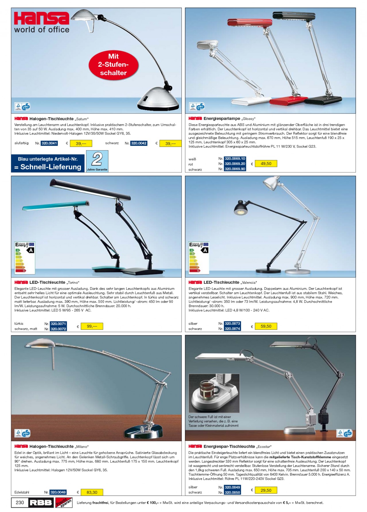 INHALT: Mit 2-Stufenschalter Halogen-Tischleuchte ,,Saturn" Verstellung am Leuchtenarm und Leuchtenkopf. Inklusive praktischem 2-Stufenschalter, zum Umschalten von 35 auf 50 W. Ausladung max. 400 mm, Höhe max. 410 mm. Inklusive Leuchtmittel: Niedervolt-Halogen 12V/35/50W Sockel GY6, 35. alufarbig Nr. 320.0041 Energiesparlampe ,,Glossy" Diese Energiesparleuchte aus ABS und Aluminium mit glänzender Oberfläche ist in drei trendigen Farben erhältlich. Der Leuchtenkopf ist horizontal und vertikal drehbar. Das Leuchtmittel bietet eine ausgezeichnete Beleuchtung mit geringem Stromverbrauch. Der Reflektor sorgt für eine blendfreie und gleichmäßige Beleuchtung. Ausladung max. 670 mm, Höhe 515 mm, Leuchtenfuß 190 x 25 x 125 mm, Leuchtenkopf 305 x 60 x 25 mm. Inklusive Leuchtmittel: Energiesparleuchtstoffröhre PL 11 W/230 V, Sockel G23. Nr. 320.0069.10 Nr. 320.0069.20 Nr. 320.0069.90 39, schwarz Nr. 320.0042 39, Blau unterlegte Artikel-Nr. = Schnell-Lieferung Jahre Garantie 2 weiß rot schwarz 49,50 LED-Tischleuchte ,,Torino" Elegante LED-Leuchte mit grosser Ausladung. Dank des sehr langen Leuchtenkopfs aus Aluminium entseht sehr helles Licht für eine optimale Ausleuchtung. Sehr stabil durch Leuchtenfuß aus Metall. Der Leuchtenkopf ist horizontal und vertikal drehbar. Schalter am Leuchtenkopf. In türkis und schwarz matt lieferbar. Ausladung max. 390 mm, Höhe max. 500 mm. Lichtleistung/ -strom: 450 lm oder 90 lm/W. Leistungsaufnahme: 5 W. Durchschnittliche Brenndauer: 20.000 h. Inklusive Leuchtmittel: LED 5 W/95 - 265 V AC. LED-Tischleuchte ,,Valencia" Elegante LED-Leuchte mit grosser Ausladung. Doppelarm aus Aluminium. Der Leuchtenkopf ist vertikal verstellbar. Schalter am Leuchtenkopf. Der Leuchtenfuß ist aus stabilem Stahl. Weiches, angenehmes Leselicht. Inklusive Leuchtmittel. Ausladung max. 900 mm, Höhe max. 720 mm. Lichtleistung/ -strom: 350 lm oder 73 lm/W. Leistungsaufnahme: 4,8 W. Durchschnittliche Brenndauer: 30.000 h. Inklusive Leuchtmittel: LED 4,8 W/100 - 240 V AC. türkis schwarz, matt Nr. 320.0071 Nr. 320.0072 99, silber schwarz Nr. 320.0073 Nr. 320.0074 59,50 Der schwere Fuß ist mit einer Vertiefung versehen, die z. B. eine Tasse oder Kleinmaterial aufnimmt Halogen-Tischleuchte ,,Milano" Edel in der Optik, brillant im Licht eine Leuchte für gehobene Ansprüche. Satinierte Glasabdeckung für weiches, angenehmes Licht. An den Gelenken Metall-Schraubgriffe. Leuchtenkopf lässt sich um 90° drehen. Ausladung max. 775 mm, Höhe max. 680 mm. Leuchtenfuß 175 x 150 mm. Leuchtenkopf 125 mm. Inklusive Leuchtmittel: Halogen 12V/50W Sockel GY6, 35. Energiespar-Tischleuchte ,,Ecostar" Die praktische Einsteigerleuchte liefert ein blendfreies Licht und bietet einen praktischen Zusatznutzen im Leuchtenfuß. Für enge Platzverhältnisse kann die mitgelieferte Tisch-Kunststoffklemme eingesetzt werden. Langestreckter 330 mm Reflektor sorgt für eine schattenfreie Ausleuchtung. Der Leuchtenkopf ist waagerecht und senkrecht verstellbar. Stufenlose Verstellung der Leuchtenarme. Sicherer Stand durch den 1,8kg schweren Fuß. Ausladung max. 650 mm, Höhe max. 705 mm. Leuchtenfuß 200 x 140 x 50 mm. Tischklemme-Öffnung 50 mm. Tageslichtqualität von 6400 Kelvin. Brenndauer 5.000 h. Energieeffizienz A. Inklusive Leuchtmittel: Röhre PL 11W/220-240V Sockel G23. silber schwarz Nr. 320.0049 Nr. 320.0050 Edelstahl Nr. 320.0048 83,30 29,50 230 Lieferung frachtfrei, für Bestellungen unter 100, + MwSt. wird eine anteilige Verpackungs- und Versandkostenpauschale von 5, + MwSt. berechnet.