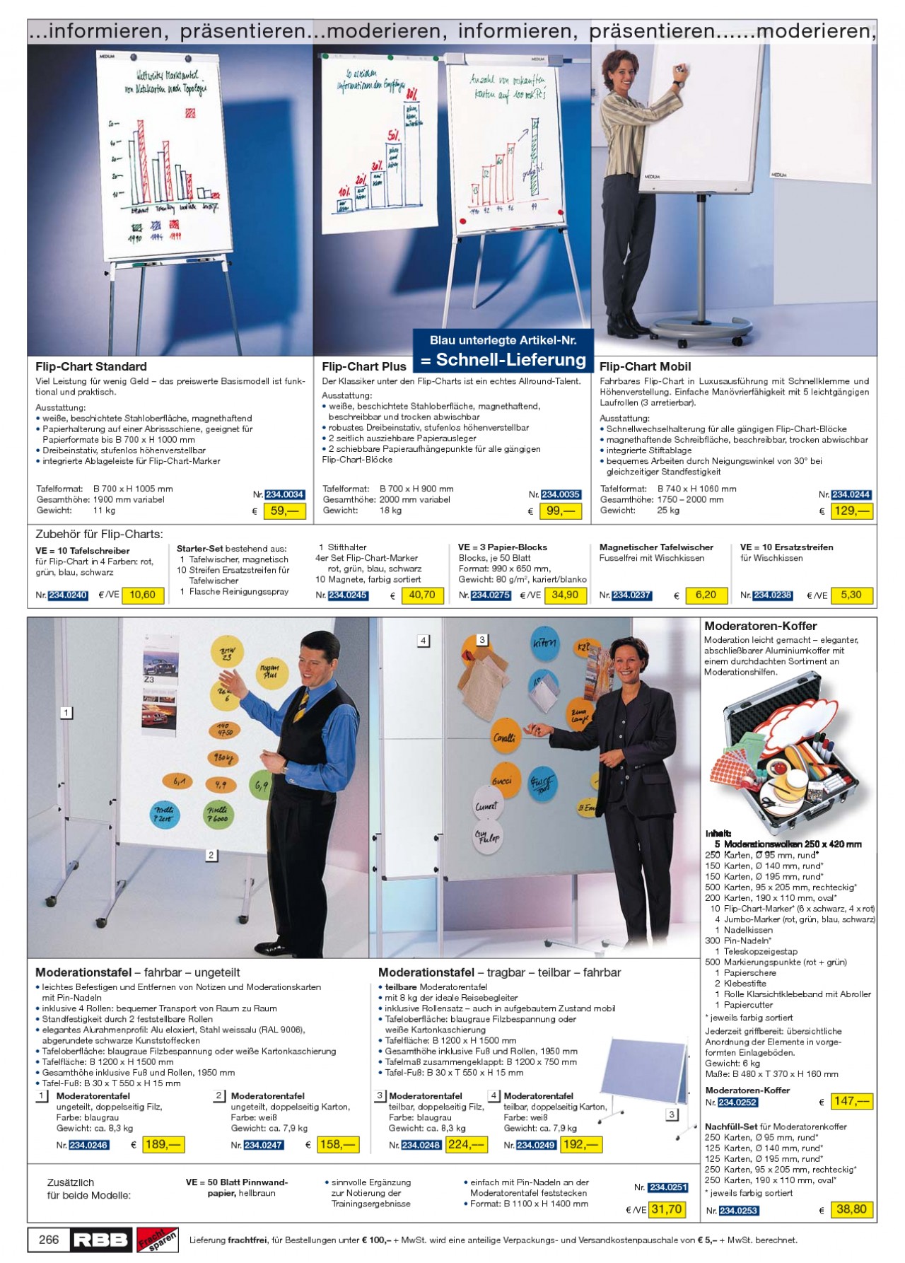 INHALT: ...informieren, präsentieren...moderieren, informieren, präsentieren......moderieren, Blau unterlegte Artikel-Nr. Flip-Chart Standard Viel Leistung für wenig Geld das preiswerte Basismodell ist funktional und praktisch. Ausstattung: · weiße, beschichtete Stahloberfläche, magnethaftend · Papierhalterung auf einer Abrissschiene, geeignet für Papierformate bis B 700 x H 1000 mm · Dreibeinstativ, stufenlos höhenverstellbar · integrierte Ablageleiste für Flip-Chart-Marker Tafelformat: B 700 x H 1005 mm Gesamthöhe: 1900 mm variabel Gewicht: 11 kg Flip-Chart Plus = Schnell-Lieferung Flip-Chart Mobil Fahrbares Flip-Chart in Luxusausführung mit Schnellklemme und Höhenverstellung. Einfache Manövrierfähigkeit mit 5 leichtgängigen Laufrollen (3 arretierbar). Ausstattung: · Schnellwechselhalterung für alle gängigen Flip-Chart-Blöcke · magnethaftende Schreibfläche, beschreibbar, trocken abwischbar · integrierte Stiftablage · bequemes Arbeiten durch Neigungswinkel von 30° bei gleichzeitiger Standfestigkeit Tafelformat: B 740 x H 1060 mm Gesamthöhe: 1750 2000 mm Gewicht: 25 kg Nr. 234.0244 Der Klassiker unter den Flip-Charts ist ein echtes Allround-Talent. Ausstattung: · weiße, beschichtete Stahloberfläche, magnethaftend, beschreibbar und trocken abwischbar · robustes Dreibeinstativ, stufenlos höhenverstellbar · 2 seitlich ausziehbare Papierausleger · 2 schiebbare Papieraufhängepunkte für alle gängigen Flip-Chart-Blöcke Tafelformat: B 700 x H 900 mm Gesamthöhe: 2000 mm variabel Gewicht: 18 kg Nr. 234.0034 Nr. 234.0035 59, Starter-Set bestehend aus: 1 Tafelwischer, magnetisch 10 Streifen Ersatzstreifen für Tafelwischer 1 Flasche Reinigungsspray 99, VE = 3 Papier-Blocks Blocks, je 50 Blatt Format: 990 x 650 mm, Gewicht: 80 g/m2, kariert/blanko Nr. 234.0275 /VE 129, VE = 10 Ersatzstreifen für Wischkissen Zubehör für Flip-Charts: VE = 10 Tafelschreiber für Flip-Chart in 4 Farben: rot, grün, blau, schwarz Nr. 234.0240 /VE 1 Stifthalter 4er Set Flip-Chart-Marker rot, grün, blau, schwarz 10 Magnete, farbig sortiert Nr. 234.0245 Magnetischer Tafelwischer Fusselfrei mit Wischkissen 10,60 40,70 34,90 Nr. 234.0237 6,20 Nr. 234.0238 /VE 5,30 Moderatoren-Koffer 4 3 Moderation leicht gemacht eleganter, abschließbarer Aluminiumkoffer mit einem durchdachten Sortiment an Moderationshilfen. 1 2 Moderationstafel fahrbar ungeteilt · leichtes Befestigen und Entfernen von Notizen und Moderationskarten mit Pin-Nadeln · inklusive 4 Rollen: bequemer Transport von Raum zu Raum · Standfestigkeit durch 2 feststellbare Rollen · elegantes Alurahmenprofil: Alu eloxiert, Stahl weissalu (RAL 9006), abgerundete schwarze Kunststoffecken · Tafeloberfläche: blaugraue Filzbespannung oder weiße Kartonkaschierung · Tafelfläche: B 1200 x H 1500 mm · Gesamthöhe inklusive Fuß und Rollen, 1950 mm · Tafel-Fuß: B 30 x T 550 x H 15 mm 1 Moderatorentafel 2 Moderatorentafel ungeteilt, doppelseitig Filz, ungeteilt, doppelseitig Karton, Farbe: blaugrau Farbe: weiß Gewicht: ca. 8,3 kg Gewicht: ca. 7,9 kg Nr. 234.0246 Moderationstafel tragbar teilbar fahrbar · teilbare Moderatorentafel · mit 8 kg der ideale Reisebegleiter · inklusive Rollensatz auch in aufgebautem Zustand mobil · Tafeloberfläche: blaugraue Filzbespannung oder weiße Kartonkaschierung · Tafelfläche: B 1200 x H 1500 mm · Gesamthöhe inklusive Fuß und Rollen, 1950 mm · Tafelmaß zusammengeklappt: B 1200 x 750 mm · Tafel-Fuß: B 30 x T 550 x H 15 mm 3 Moderatorentafel 4 Moderatorentafel teilbar, doppelseitig Filz, teilbar, doppelseitig Karton, Farbe: blaugrau Farbe: weiß Gewicht: ca. 8,3 kg Gewicht: ca. 7,9 kg Nr. 234.0248 Inhalt: 5 Moderationswolken 250 x 420 mm 250 Karten, Ø 95 mm, rund* 150 Karten, Ø 140 mm, rund* 150 Karten, Ø 195 mm, rund* 500 Karten, 95 x 205 mm, rechteckig* 200 Karten, 190 x 110 mm, oval* 10 Flip-Chart-Marker* (6 x schwarz, 4 x rot) 4 Jumbo-Marker (rot, grün, blau, schwarz) 1 Nadelkissen 300 Pin-Nadeln* 1 Teleskopzeigestap 500 Markierungspunkte (rot + grün) 1 Papierschere 2 Klebestifte 1 Rolle Klarsichtklebeband mit Abroller 1 Papiercutter * jeweils farbig sortiert Jederzeit griffbereit: übersichtliche Anordnung der Elemente in vorgeformten Einlageböden. Gewicht: 6 kg Maße: B 480 x T 370 x H 160 mm Moderatoren-Koffer Nr. 234.0252 3 Nachfüll-Set für Moderatorenkoffer 250 Karten, Ø 95 mm, rund* 125 Karten, Ø 140 mm, rund* 125 Karten, Ø 195 mm, rund* 250 Karten, 95 x 205 mm, rechteckig* 250 Karten, 190 x 110 mm, oval* * jeweils farbig sortiert Nr. 234.0253 147, 189, Nr. 234.0247 158, 224, Nr. 234.0249 192, Zusätzlich für beide Modelle: VE = 50 Blatt Pinnwandpapier, hellbraun · sinnvolle Ergänzung zur Notierung der Trainingsergebnisse · einfach mit Pin-Nadeln an der Moderatorentafel feststecken · Format: B 1100 x H 1400 mm Nr. 234.0251 /VE 31,70 38,80 266 Lieferung frachtfrei, für Bestellungen unter 100, + MwSt. wird eine anteilige Verpackungs- und Versandkostenpauschale von 5, + MwSt. berechnet.
