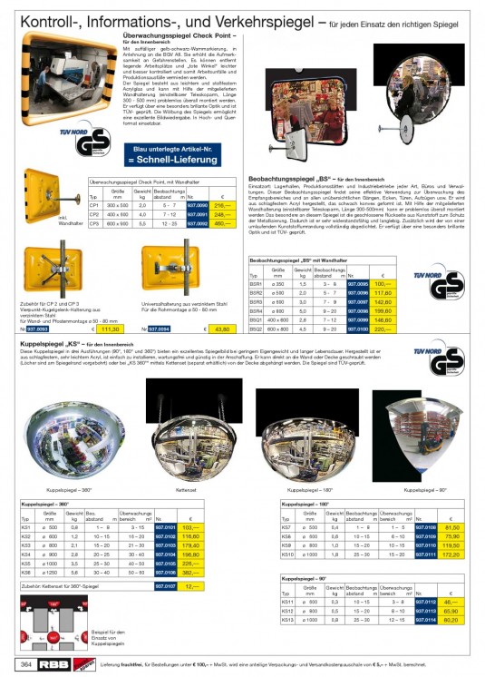 INHALT: Kontroll-, Informations-, und Verkehrspiegel für jeden Einsatz den richtigen Spiegel Überwachungsspiegel Check Point für den Innenbereich Mit auffälliger gelb-schwarz-Warnmarkierung, in Anlehnung an die BGV A8. Sie erhöht die Aufmerksamkeit an Gefahrenstellen. Es können entfernt liegende Arbeitsplätze und ,,tote Winkel" leichter und besser kontrolliert und somit Arbeitsunfälle und Produktionsausfälle vermieden werden. Der Spiegel besteht aus leichtem und stoßfestem Acrylglas und kann mit Hilfe der mitgelieferten Wandhalterung (einstellbarer Teleskoparm, Länge 300 - 500 mm) problemlos überall montiert werden. Er verfügt über eine besonders brillante Optik und ist TÜV- geprüft. Die Wölbung des Spiegels ermöglicht eine exzellente Bildwiedergabe. In Hoch- und Querformat einsetzbar. Blau unterlegte Artikel-Nr. = Schnell-Lieferung Überwachungsspiegel Check Point, mit Wandhalter Typ CP1 inkl. Wandhalter CP2 CP3 Größe mm 300 x 500 400 x 600 600 x 900 Gewicht Beobachtungs kg abstand m Nr. 2,0 4,0 5,5 5- 7 7 - 12 12 - 25 937.0090 937.0091 937.0092 Beobachtungsspiegel ,,BS" für den Innenbereich Einsatzort: Lagerhallen, Produktionsstätten und Industriebetriebe jeder Art, Büros und Verwaltungen. Dieser Beobachtungsspiegel findet seine effektive Verwendung zur Überwachung des Empfangsbereiches und an allen unübersichtlichen Gängen, Ecken, Türen, Aufzügen usw. Er wird aus schlagfestem Acryl hergestellt, das schwach konvex geformt ist. Mit Hilfe der mitgelieferten Wandhalterung (einstellbarer Teleskoparm, Länge 300-500mm) kann er problemlos überall montiert werden Das besondere an diesem Spiegel ist die geschlossene Rückseite aus Kunststoff zum Schutz der Metallisierung. Dadurch ist er sehr widerstandsfähig und langlebig. Zusätzlich wird der von einer umlaufenden Kunststoffumrandung vollständig abgedichtet. Er verfügt über eine besonders brillante Optik und ist TÜV- geprüft. 216, 248, 460, Beobachtungsspiegel ,,BS" mit Wandhalter Typ BSR1 BSR2 Größe mm ø 350 ø 500 ø 600 ø 800 400 x 600 600 x 800 Gewicht Beobachtungs kg abstand m Nr. 1,5 2,0 3,0 5,0 2,8 4,5 3- 8 5- 7 7- 9 9 20 7 12 9 20 937.0095 937.0096 937.0097 937.0098 937.0099 937.0100 100, 117,60 142,60 199,60 146,60 220, Zubehör für CP 2 und CP 3 Vierpunkt-Kugelgelenk-Halterung aus verzinktem Stahl für Wand- und Pfostenmontage ø 50 - 80 mm Nr. 937.0093 Universalhalterung aus verzinktem Stahl Für die Rohrmontage ø 50 - 80 mm BSR3 BSR4 BSQ1 111,30 Nr. 937.0094 43,80 BSQ2 Kuppelspiegel ,,KS" für den Innenbereich Diese Kuppelspiegel in drei Ausführungen (90°, 180° und 360°) bieten ein exzellentes Spiegelbild bei geringem Eigengewicht und langer Lebensdauer. Hergestellt ist er aus schlagfestem, sehr leichtem Acryl, ist einfach zu installieren, wartungsfrei und günstig in der Anschaffung. Er kann direkt an die Wand oder Decke geschraubt werden (Löcher sind am Spiegelrand vorgebohrt) oder bei ,,KS 360°" mittels Kettenset (separat erhältlich) von der Decke abgehängt werden. Die Spiegel sind TÜV-geprüft. Kuppelspiegel 360° Kuppelspiegel 360° Typ KS1 KS2 KS3 KS4 KS5 KS6 Größe mm ø 500 ø 600 ø 800 ø 900 ø 1000 ø 1250 Gewicht Beo. kg abstand 0,8 1,2 2,1 2,8 3,5 5,6 1 8 10 15 15 20 20 25 25 30 30 40 Überwachungs m bereich m2 Nr. 3 - 15 16 20 21 30 30 - 40 40 50 50 60 937.0101 937.0102 937.0103 937.0104 937.0105 937.0106 937.0107 Kettenset Kuppelspiegel 180° Kuppelspiegel 180° Kuppelspiegel 90° Typ KS7 KS8 KS9 KS10 Größe mm ø 500 ø 600 ø 800 ø 1000 Gewicht Beobachtungs Überwachungs kg abstand m bereich m2 Nr. 0,4 0,6 1,0 1,8 1 8 10 15 15 20 25 30 1 5 6 10 10 15 15 20 937.0108 937.0109 937.0110 937.0111 103, 116,60 179,40 196,80 226, 382, 81,50 75,90 119,50 172,20 Kuppelspiegel 90° Zubehör: Kettenset für 360°-Spiegel 12, Typ KS11 KS12 KS13 Größe mm ø 600 ø 800 ø 1000 Gewicht Beobachtungs Überwachungs kg abstand m bereich m2 Nr. 0,3 0,5 0,8 10 15 15 20 25 30 3 8 8 10 12 15 937.0112 937.0113 937.0114 46, 65,90 80,20 Beispiel für den Einsatz von Kuppelspiegeln 364 Lieferung frachtfrei, für Bestellungen unter 100, + MwSt. wird eine anteilige Verpackungs- und Versandkostenpauschale von 5, + MwSt. berechnet.