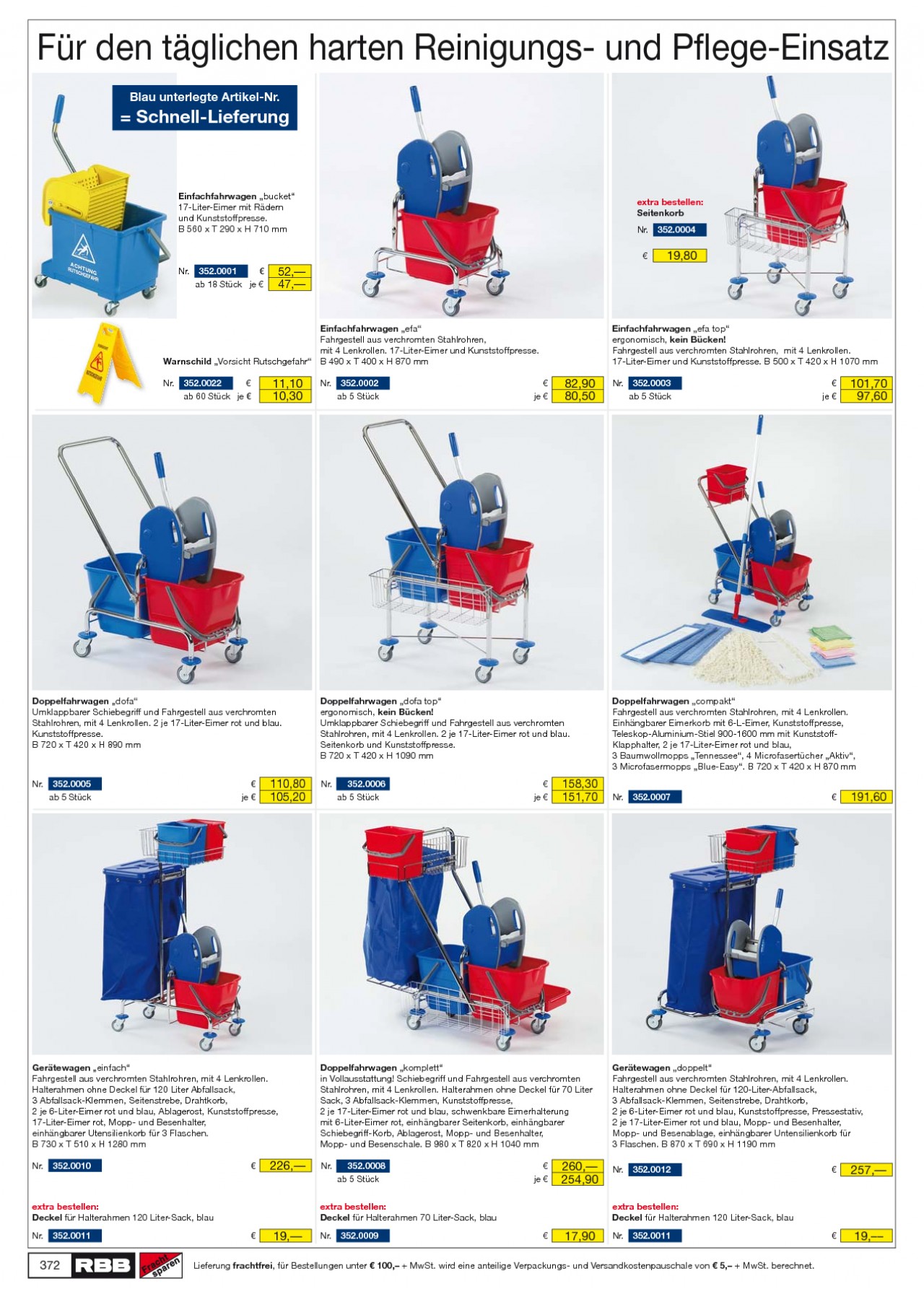 INHALT: Für den täglichen harten Reinigungs- und Pflege-Einsatz Blau unterlegte Artikel-Nr. = Schnell-Lieferung Einfachfahrwagen ,,bucket" 17-Liter-Eimer mit Rädern und Kunststoffpresse. B 560 x T 290 x H 710 mm extra bestellen: Seitenkorb Nr. 352.0004 19,80 Nr. 352.0001 ab 18 Stück je 52, 47, Einfachfahrwagen ,,efa" Fahrgestell aus verchromten Stahlrohren, mit 4 Lenkrollen. 17-Liter-Eimer und Kunststoffpresse. Warnschild ,,Vorsicht Rutschgefahr" B 490 x T 400 x H 870 mm Nr. 352.0022 ab 60 Stück je Einfachfahrwagen ,,efa top" ergonomisch, kein Bücken! Fahrgestell aus verchromten Stahlrohren, mit 4 Lenkrollen. 17-Liter-Eimer und Kunststoffpresse. B 500 x T 420 x H 1070 mm 11,10 10,30 Nr. 352.0002 ab 5 Stück je 82,90 80,50 Nr. 352.0003 ab 5 Stück je 101,70 97,60 Doppelfahrwagen ,,dofa" Umklappbarer Schiebegriff und Fahrgestell aus verchromten Stahlrohren, mit 4 Lenkrollen. 2 je 17-Liter-Eimer rot und blau. Kunststoffpresse. B 720 x T 420 x H 890 mm Doppelfahrwagen ,,dofa top" ergonomisch, kein Bücken! Umklappbarer Schiebegriff und Fahrgestell aus verchromten Stahlrohren, mit 4 Lenkrollen. 2 je 17-Liter-Eimer rot und blau. Seitenkorb und Kunststoffpresse. B 720 x T 420 x H 1090 mm Nr. 352.0006 ab 5 Stück je Doppelfahrwagen ,,compakt" Fahrgestell aus verchromten Stahlrohren, mit 4 Lenkrollen. Einhängbarer Eimerkorb mit 6-L-Eimer, Kunststoffpresse, Teleskop-Aluminium-Stiel 900-1600 mm mit KunststoffKlapphalter, 2 je 17-Liter-Eimer rot und blau, 3 Baumwollmopps ,,Tennessee", 4 Microfasertücher ,,Aktiv", 3 Microfasermopps ,,Blue-Easy". B 720 x T 420 x H 870 mm Nr. 352.0007 Nr. 352.0005 ab 5 Stück je 110,80 105,20 158,30 151,70 191,60 Gerätewagen ,,einfach" Fahrgestell aus verchromten Stahlrohren, mit 4 Lenkrollen. Halterahmen ohne Deckel für 120 Liter Abfallsack, 3 Abfallsack-Klemmen, Seitenstrebe, Drahtkorb, 2 je 6-Liter-Eimer rot und blau, Ablagerost, Kunststoffpresse, 17-Liter-Eimer rot, Mopp- und Besenhalter, einhängbarer Utensilienkorb für 3 Flaschen. B 730 x T 510 x H 1280 mm Nr. 352.0010 Doppelfahrwagen ,,komplett" in Vollausstattung! Schiebegriff und Fahrgestell aus verchromten Stahlrohren, mit 4 Lenkrollen. Halterahmen ohne Deckel für 70 Liter Sack, 3 Abfallsack-Klemmen, Kunststoffpresse, 2 je 17-Liter-Eimer rot und blau, schwenkbare Eimerhalterung mit 6-Liter-Eimer rot, einhängbarer Seitenkorb, einhängbarer Schiebegriff-Korb, Ablagerost, Mopp- und Besenhalter, Mopp- und Besenschale. B 980 x T 820 x H 1040 mm Nr. 352.0008 ab 5 Stück je Gerätewagen ,,doppelt" Fahrgestell aus verchromten Stahlrohren, mit 4 Lenkrollen. Halterahmen ohne Deckel für 120-Liter-Abfallsack, 3 Abfallsack-Klemmen, Seitenstrebe, Drahtkorb, 2 je 6-Liter-Eimer rot und blau, Kunststoffpresse, Pressestativ, 2 je 17-Liter-Eimer rot und blau, Mopp- und Besenhalter, Mopp- und Besenablage, einhängbarer Untensilienkorb für 3 Flaschen. B 870 x T 690 x H 1190 mm Nr. 352.0012 226, 260, 254,90 257, extra bestellen: Deckel für Halterahmen 120 Liter-Sack, blau Nr. 352.0011 extra bestellen: Deckel für Halterahmen 70 Liter-Sack, blau extra bestellen: Deckel für Halterahmen 120 Liter-Sack, blau 19, Nr. 352.0009 17,90 Nr. 352.0011 19, 372 Lieferung frachtfrei, für Bestellungen unter 100, + MwSt. wird eine anteilige Verpackungs- und Versandkostenpauschale von 5, + MwSt. berechnet.