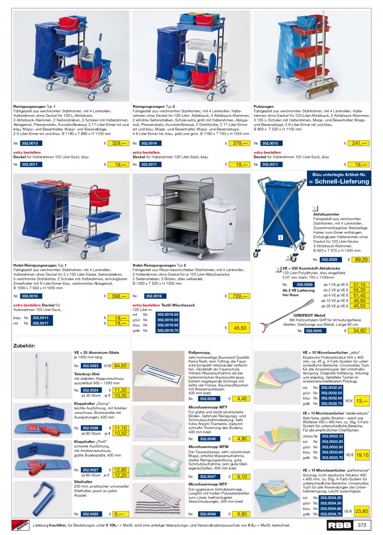 INHALT: Reinigungswagen Typ 1 Fahrgestell aus verchromten Stahlrohren, mit 4 Lenkrollen. Halterahmen ohne Deckel für 120-L-Abfallsack, 3 Abfallsack-Klemmen, 2 Seitenstreben, 3 Schalen mit Halterahmen, Ablagerost, Pressenstativ, Kunststoffpresse, 2 17-Liter-Eimer rot und blau, Mopp- und Besenhalter, Mopp- und Besenablage, 2 6-Liter-Eimer rot und blau. B 1180 x T 690 x H 1100 mm Nr. 352.0013 Reinigungswagen Typ 2 Fahrgestell aus verchromten Stahlrohren, mit 4 Lenkrollen. Halterahmen ohne Deckel für 120-Liter- Abfallsack, 3 Abfallsack-Klemmen, 2 erhöhte Seitenstreben, Schale extra groß mit Halterahmen, Ablagerost, Pressenstativ, Kunststoffpresse, 2 Drahtkörbe, 2 17-Liter-Eimer rot und blau, Mopp- und Besenhalter, Mopp- und Besenablage, 4 6-Liter-Eimer rot, blau, gelb und grün. B 1160 x T 700 x H 1250 mm Nr. 352.0014 Putzwagen Fahrgestell aus verchromten Stahlrohren, mit 4 Lenkrollen. Halterahmen ohne Deckel für 120-Liter-Abfallsack, 3 Abfallsack-Klemmen, 3 120-L-Schalen mit Halterahmen, Mopp- und Besenhalter, Moppund Besenablage, 2 6-Liter-Eimer rot und blau. B 900 x T 520 x H 1100 mm 329, 379, Nr. 352.0015 241, extra bestellen: Deckel für Halterahmen 120 Liter-Sack, blau Nr. 352.0011 extra bestellen: Deckel für Halterahmen 120 Liter-Sack, blau extra bestellen: Deckel für Halterahmen 120 Liter-Sack, blau 19, Nr. 352.0011 19, Nr. 352.0011 19, Blau unterlegte Artikel-Nr. = Schnell-Lieferung 1 Abfallsammler Fahrgestell aus verchromten Stahlrohren, mit 4 Lenkrollen. Zusammenklappbar. Beidseitige Haken zum Eimer einhängen. Einhängbarer Halterahmen ohne Deckel für 120 Liter-Säcke. 3 Abfallsack-Klemmen. B 620 x T 570 x H 1000 mm 1 Hotel-Reinigungswagen Typ 1 Fahrgestell aus verchromten Stahlrohren, mit 4 Lenkrollen. Halterahmen ohne Deckel für 2 x 120 Liter-Säcke, Seitenstreben, 3 verchromte Drahtkörbe, 2 Schalen mit Halterahmen, einhängbarer Eimerhalter mit 6-Liter-Eimer blau, verchromtes Ablagerost. B 1550 x T 630 x H 1060 mm Nr. 352.0016 Hotel-Reinigungswagen Typ 2 Fahrgestell aus Rilsan beschichteten Stahlrohren, mit 4 Lenkrollen. 2 Halterahmen ohne Deckel für je 120 Liter-Wäschesäcke, 2 Seitenstreben, 3 Böden, alles verkleidet. B 1630 x T 520 x H 1300 mm Nr. 352.0018 Nr. 352.0020 2 89,20 2 VE = 250 Kunststoff-Abfallsäcke 120 Liter Polyäthylen, blau eingefärbt, 0,07 mm stark, 700 x 1100mm Nr. 358.0008 Ab 2 VE Lieferung frei Haus ab 1 VE je VE ab 2 VE je VE ab 4 VE je VE ab 10 VE je VE ab 20 VE je VE 398, 729, extra bestellen: Deckel für Halterahmen 120 Liter-Sack, blau Nr. rot Nr. 352.0011 352.0017 19, 19, extra bestellen: Textil-Wäschesack 120 Liter in: rot Nr. 352.0019.20 grün Nr. 352.0019.50 blau Nr. 352.0019.60 gelb Nr. 352.0019.70 57,10 55,30 51,40 49,90 45,50 45,50 GREIFBOY Metall Mit Horizontalem Griff für ermüdungsfreies Greifen. Greifzange aus Metall, Länge 90 cm. Nr. 352.0045 34,60 Zubehör: VE = 25 Aluminium-Stiele je 1400 mm lang Nr. 352.0023 /VE Rallyemopp, sehr hochwertige Baumwoll-Qualität. Keine Naht, kein Tufting; die Faser wird komplett miteinander verflochten. Deckblatt als Faserschutz. Höhere Wasseraufnahme als bei herkömmlichen Baumwollmopps. Extrem engliegende Schlinge mit extra viel Franse. Baumwolltaschen mit Wasserauslässen. 400 mm breit Nr. 352.0029 VE = 10 Microfasertücher ,,aktiv" Elastische Frottierstruktur 400 x 400 mm, ca. 45 g. 4-Farb-System für unterschiedliche Bereiche. Universelles Tuch für alle Anwendungen der Unterhaltsreinigung. Doppelte Kettelung. Volumig und ergiebig. Gefaltete Tücher im wiederverschließbarem Polybag: rot grün blau gelb Nr. Nr. Nr. Nr. 352.0032.20 352.0032.50 352.0032.60 VE/ 352.0032.70 84,50 Teleskop-Stiel mit stabilem Klappverschluss, ausziehbar 900 1600 mm Nr. 352.0024 ab 20 Stück je 11,30 10,30 4,45 Klapphalter ,,Swing" leichte Ausführung, mit Arretierverschluss, Bodenplatte mit Aussparungen, 400 mm Nr. 352.0026 ab 60 Stück je 13, 11,10 10,50 Microfasermopp MTT Für glatte und leicht strukturierte Böden. Optimale Reinigungs- und Schmutzaufnahmeleistung. Sehr hohe Anzahl Filamente, dadurch schnelle Trocknung des Bodens, 400 mm breit Nr. 352.0046 VE = 10 Microfasertücher "seidenvelours" Sehr feine, glatte Struktur weich wie Wildleder 400 x 400 mm, ca. 35g. 5-FarbSystem für unterschiedliche Bereiche. Für alle empfindlichen Oberflächen. chamois Nr. rot Nr. grün Nr. blau Nr. gelb Nr. 352.0033.10 352.0033.20 352.0033.50 352.0033.60 VE/ 352.0033.70 Klapphalter ,,Profi" schwere Ausführung, mit Arretierverschluss, glatte Bodenplatte, 400 mm 4,90 Nr. 352.0027 ab 60 Stück je 12,80 12,20 Microfasermopp MTM Der Tausendsassa, sehr voluminöser Mopp, erhöhte Wasseraufnahme, starke Reinigungswirkung, gute Schmutzaufnahme, sehr gute Gleiteigenschaften, 400 mm breit Nr. 352.0047 19,10 6,10 Stielhalter 230 mm, praktischer universeller Stielhalter, passt an jeden Alustiel Microfasermopp MTF Der aggressive Schrubbermopp, Langflor mit harten Polyesterstreifen zum Lösen hartnäckigster Verschmutzungen, 400 mm breit Nr. 352.0048 VE = 10 Microfasertücher ,,performance" Volumig, nicht elastische Struktur 400 x 400 mm, ca. 55g. 4-Farb-System für unterschiedliche Bereiche. Universelles Tuch für alle Anwendungen der Unterhaltsreinigung. Leicht auswringbar. rot grün blau gelb Nr. Nr. Nr. Nr. 352.0034.20 352.0034.50 352.0034.60 VE/ 352.0034.70 Nr. 352.0025 6, 6,80 23,80 373 Lieferung frachtfrei, für Bestellungen unter 100, + MwSt. wird eine anteilige Verpackungs- und Versandkostenpauschale von 5, + MwSt. berechnet.