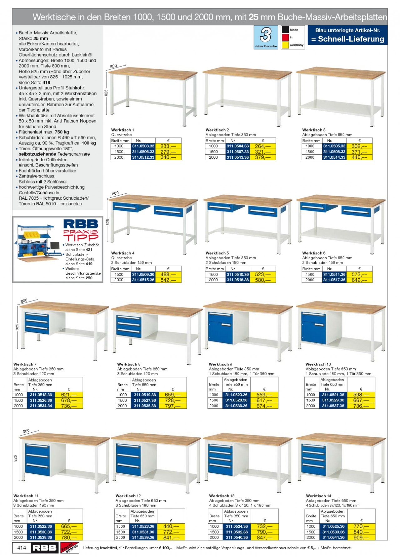 INHALT: Werktische in den Breiten 1000, 1500 und 2000 mm, mit 25 mm Buche-Massiv-Arbeitsplatten · Buche-Massiv-Arbeitsplatte, Stärke 25 mm alle Ecken/Kanten bearbeitet, Vorderkante mit Radius Oberflächenschutz durch Lackleinöl · Abmessungen: Breite 1000, 1500 und 2000 mm, Tiefe 800 mm, Höhe 825 mm (Höhe über Zubehör verstellbar von 825 - 1025 mm, siehe Seite 419 · Untergestell aus Profil-Stahlrohr 45 x 45 x 2 mm, mit 2 Werkbankfüßen inkl. Querstreben, sowie einem umlaufenden Rahmen zur Aufnahme der Tischplatte · Werkbankfüße mit Abschlusselement 50 x 50 mm inkl. Anti-Rutsch-Noppen für sicheren Stand · Flächenlast max. 750 kg · Schubladen: Innen B 490 x T 560 mm, Auszug ca. 90 %, Tragkraft ca. 100 kg · Türen: Öffnungsweite 180°, selbstzuziehende Federscharniere · teilintegrierte Griffleisten einschl. Beschriftungsstreifen · Fachböden höhenverstellbar · Zentralverschluss, Schloss mit 2 Schlüssel · hochwertige Pulverbeschichtung Gestelle/Gehäuse in RAL 7035 lichtgrau; Schubladen/ Türen in RAL 5010 enzianblau Jahre Garantie 3 Made in Germany Blau unterlegte Artikel-Nr. = Schnell-Lieferung 800 825 Werktisch 1 Querstrebe Breite mm Nr. 1000 311.0503.33 1500 311.0506.33 2000 311.0512.33 Werktisch 2 Ablageboden Tiefe 350 mm Werktisch 3 Ablageboden Tiefe 650 mm Breite mm Nr. 1000 311.0505.33 1500 311.0508.33 2000 311.0514.33 233, 279, 340, Breite mm Nr. 1000 311.0504.33 1500 311.0507.33 2000 311.0513.33 264, 321, 379, 302, 371, 440, 800 · Werktisch-Zubehör siehe Seite 421 · SchubladenEinteilungs-Sets siehe Seite 419 · Weitere Beschriftungsgeräte siehe Seite 250 825 Werktisch 4 Querstrebe 2 Schubladen 150 mm Breite mm Nr. 1500 311.0509.36 2000 311.0515.36 Werktisch 5 Ablageboden Tiefe 350 mm 2 Schubladen 150 mm Werktisch 6 Ablageboden Tiefe 650 mm 2 Schubladen 150 mm Breite mm Nr. 1500 311.0511.36 2000 311.0517.36 488, 542, Breite mm Nr. 1500 311.0510.36 2000 311.0516.36 523, 580, 573, 642, 800 825 Werktisch 7 Ablageboden Tiefe 350 mm 3 Schubladen 120 mm Breite mm 1000 1500 2000 Ablageboden Tiefe 350 mm Nr. 311.0518.36 311.0526.36 311.0534.34 Werktisch 8 Ablageboden Tiefe 650 mm 3 Schubladen 120 mm Breite mm 1000 1500 2000 Ablageboden Tiefe 650 mm Nr. 311.0519.36 311.0527.36 311.0535.36 Werktisch 9 Ablageboden Tiefe 350 mm 1 Schublade 180 mm, 1 Tür 360 mm Breite mm 1000 1500 2000 Ablageboden Tiefe 350 mm Nr. 311.0520.36 311.0528.36 311.0536.36 Werktisch 10 Ablageboden Tiefe 650 mm 1 Schublade 180 mm, 1 Tür 360 mm Breite mm 1000 1500 2000 Ablageboden Tiefe 650 mm Nr. 311.0521.36 311.0529.36 311.0537.36 621, 678, 736, 659, 728, 797, 559, 617, 674, 598, 667, 736, 800 Werktisch 11 Ablageboden Tiefe 350 mm 3 Schubladen 180 mm Breite mm 1000 1500 2000 Ablageboden Tiefe 350 mm Nr. 311.0522.36 311.0530.36 311.0538.36 825 Werktisch 12 Ablageboden Tiefe 650 mm 3 Schubladen 180 mm Breite mm 1000 1500 2000 Ablageboden Tiefe 650 mm Nr. 311.0523.36 311.0531.36 311.0539.36 Werktisch 13 Ablageboden Tiefe 350 mm 4 Schubladen 3 x 120, 1 x 180 mm Breite mm 1000 1500 2000 Ablageboden Tiefe 350 mm Nr. 311.0524.36 311.0532.36 311.0540.36 Werktisch 14 Ablageboden Tiefe 650 mm 4 Schubladen 3 x120, 1x180 mm Breite mm 1000 1500 2000 Ablageboden Tiefe 650 mm Nr. 311.0525.36 311.0533.36 311.0541.36 665, 722, 780, 440, 772, 841, 732, 790, 847, 770, 840, 909, 414 Lieferung frachtfrei, für Bestellungen unter 100, + MwSt. wird eine anteilige Verpackungs- und Versandkostenpauschale von 5, + MwSt. berechnet.