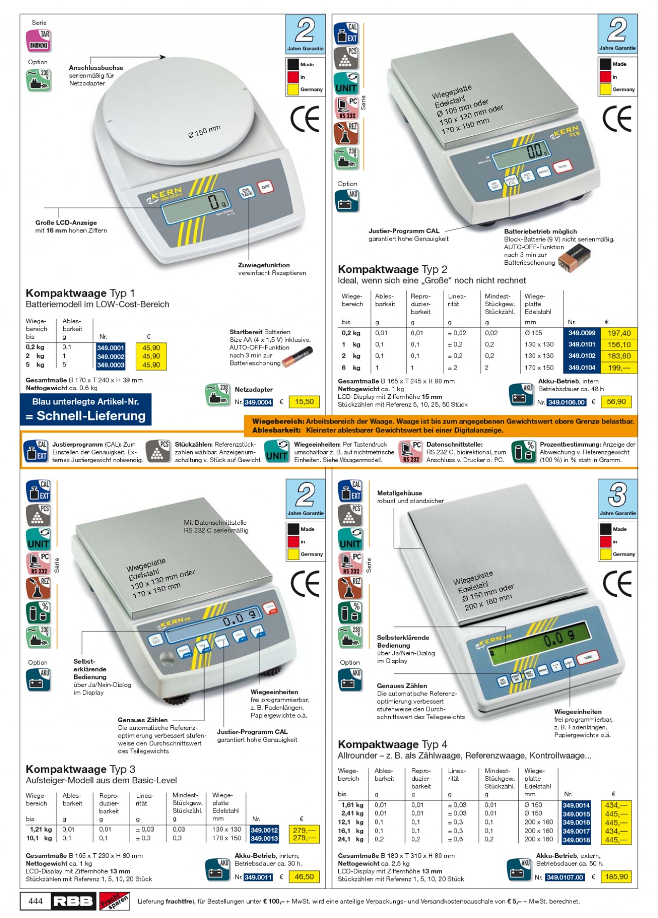INHALT: Serie Jahre Garantie 2 in Jahre Garantie Made in 2 Option Anschlussbuchse serienmäßig für Netzadapter Made Germany Ø 15 0 mm te eplat Wieg ahl t r Edels mm ode der o 5 Ø 10 130 mm x 130 150 mm x 170 Germany Option Große LCD-Anzeige mit 16 mm hohen Ziffern Serie Justier-Programm CAL garantiert hohe Genauigkeit Zuwiegefunktion vereinfacht Rezeptieren Kompaktwaage Typ 2 Wiegebereich bis Ablesbarkeit g 0,01 0,1 0,1 1 kg kg kg Reproduzierbarkeit g 0,01 0,1 0,1 1 Linearität g ± 0,02 ± 0,2 ± 0,2 ±2 Batteriebetrieb möglich Block-Batterie (9 V) nicht serienmäßig. AUTO-OFF-Funktion nach 3 min zur Batterieschonung Ideal, wenn sich eine ,,Große" noch nicht rechnet Kompaktwaage Typ 1 Batteriemodell im LOW-Cost-Bereich Wiegebereich bis 0,2 kg 2 kg 5 kg Ablesbarkeit g 0,1 1 5 Startbereit Batterien Size AA (4 x 1,5 V) inklusive. AUTO-OFF-Funktion nach 3 min zur Batterieschonung MindestStückgew. Stückzähl. g 0,02 0,2 0,2 2 Wiegeplatte Edelstahl mm Ø 105 130 x 130 130 x 130 170 x 150 Nr. 349.0099 349.0101 349.0102 349.0104 Nr. 349.0001 349.0002 349.0003 0,2 kg 1 2 6 197,40 156,10 183,60 199, 45,90 45,90 45,90 Gesamtmaße B 170 x T 240 x H 39 mm Nettogewicht ca. 0,6 kg Netzadapter Nr. 349.0004 Blau unterlegte Artikel-Nr. 15,50 Gesamtmaße B 165 x T 245 x H 80 mm Nettogewicht ca. 1 kg LCD-Display mit Ziffernhöhe 15 mm Stückzählen mit Referenz 5, 10, 25, 50 Stück Akku-Betrieb, intern Betriebsdauer ca. 48 h Nr. 349.0106.00 56,90 = Schnell-Lieferung Justierprogramm (CAL): Zum Einstellen der Genauigkeit. Externes Justiergewicht notwendig. Wiegebereich: Arbeitsbereich der Waage. Waage ist bis zum angegebenen Gewichtswert obere Grenze belastbar. Ablesbarkeit: Kleinster ablesbarer Gewichtswert bei einer Digitalanzeige. Stückzählen: Referenzstückzahlen wählbar. Anzeigenumschaltung v. Stück auf Gewicht. Wiegeeinheiten: Per Tastendruck umschaltbar z. B. auf nichtmetrische Einheiten. Siehe Waagenmodell. Datenschnittstelle: RS 232 C, bidirektional, zum Anschluss v. Drucker o. PC. Prozentbestimmung: Anzeige der Abweichung v. Referenzgewicht (100 %) in % statt in Gramm. Jahre Garantie 2 in Metallgehäuse robust und standsicher Jahre Garantie Made in Germany 3 Mit Datenschnittstelle RS 232 C serienmäßig Made Germany te eplat Wieg ahl er lst m od Ede 130 m 130 x 50 mm 1 170 x Serie Serie te eplat Wieg tahl els oder Ed 0 mm Ø 15 160 mm x 200 Option Selbsterklärende Bedienung über Ja/Nein-Dialog im Display Option Selbsterklärende Bedienung über Ja/Nein-Dialog im Display Genaues Zählen Die automatische Referenzoptimierung verbessert stufenweise den Durchschnittswert des Teilegewichts Wiegeeinheiten frei programmierbar, z. B. Fadenlängen, Papiergewichte o.ä. Justier-Programm CAL garantiert hohe Genauigkeit Genaues Zählen Die automatische Referenzoptimierung verbessert stufenweise den Durchschnittswert des Teilegewichts Wiegeeinheiten frei programmierbar, z. B. Fadenlängen, Papiergewichte o.ä. Kompaktwaage Typ 4 Allrounder z. B. als Zählwaage, Referenzwaage, Kontrollwaage... Wiegebereich Ablesbarkeit g 0,01 0,01 0,1 0,1 0,2 Reproduzierbarkeit g 0,01 0,01 0,1 0,1 0,2 Linearität g ± 0,03 ± 0,03 ± 0,3 ± 0,3 ± 0,6 MindestStückgew. Stückzähl. g 0,01 0,01 0,1 0,1 0,2 Wiegeplatte Edelstahl mm Ø 150 Ø 150 200 x 160 200 x 160 200 x 160 Kompaktwaage Typ 3 Aufsteiger-Modell aus dem Basic-Level Wiegebereich bis 1,21 kg 10,1 kg Ablesbarkeit g 0,01 0,1 Reproduzierbarkeit g 0,01 0,1 Linearität g ± 0,03 ± 0,3 MindestStückgew. Stückzähl. g 0,03 0,3 Wiegeplatte Edelstahl mm 130 x 130 170 x 150 bis 1,61 kg 2,41 kg 12,1 kg 16,1 kg 24,1 kg Nr. 349.0014 349.0015 349.0016 349.0017 349.0018 Nr. 349.0012 349.0013 279, 279, 434, 445, 445, 434, 445, Gesamtmaße B 165 x T 230 x H 80 mm Nettogewicht ca. 1 kg LCD-Display mit Ziffernhöhe 13 mm Stückzählen mit Referenz 1, 5, 10, 20 Stück Akku-Betrieb, inrtern, Betriebsdauer ca. 30 h. Nr. 349.0011 46,50 Gesamtmaße B 180 x T 310 x H 80 mm Nettogewicht ca. 2,5 kg LCD-Display mit Ziffernhöhe 13 mm Stückzählen mit Referenz 1, 5, 10, 20 Stück Akku-Betrieb, extern, Betriebsdauer ca. 50 h. Nr. 349.0107.00 185,90 444 Lieferung frachtfrei, für Bestellungen unter 100, + MwSt. wird eine anteilige Verpackungs- und Versandkostenpauschale von 5, + MwSt. berechnet.