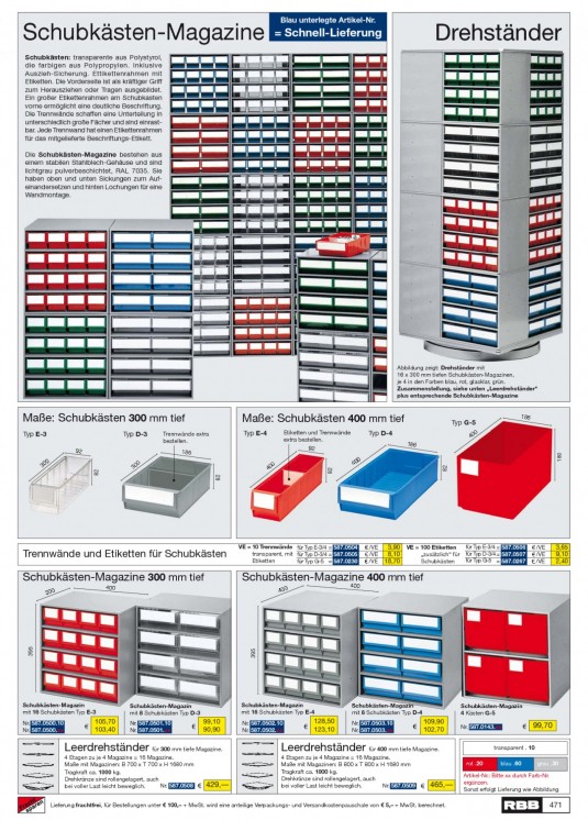 INHALT: Schubkästen-Magazine Schubkästen: transparente aus Polystyrol, die farbigen aus Polypropylen. Inklusive Auszieh-Sicherung. Ettikettenrahmen mit Etiketten. Die Vorderseite ist als kräftiger Griff zum Herausziehen oder Tragen ausgebildet. Ein großer Etikettenrahmen am Schubkasten vorne ermöglicht eine deutliche Beschriftung. Die Trennwände schaffen eine Unterteilung in unterschiedlich große Fächer und sind einrastbar. Jede Trennwand hat einen Etikettenrahmen für das mitgelieferte Beschriftungs-Etikett. Die Schubkästen-Magazine bestehen aus einem stabilen Stahlblech-Gehäuse und sind lichtgrau pulverbeschichtet, RAL 7035. Sie haben oben und unten Sickungen zum Aufeinandersetzen und hinten Lochungen für eine Wandmontage. Blau unterlegte Artikel-Nr. = Schnell-Lieferung Drehständer Abbildung zeigt: Drehständer mit 16 x 300 mm tiefen Schubkästen-Magazinen, je 4 in den Farben blau, rot, glasklar, grün. Zusammenstellung, siehe unten ,,Leerdrehständer" plus entsprechende Schubkästen-Magazine Maße: Schubkästen 300 mm tief Typ E-3 92 Maße: Schubkästen 400 mm tief Typ E-4 Etiketten und Trennwände extra bestellen. 92 Typ G-5 40 186 186 Typ D-3 Trennwände extra bestellen. Typ D-4 0 82 82 Trennwände und Etiketten für Schubkästen VE = 10 Trennwände für Typ E-3/4 = 587.0504 transparent, mit für Typ D-3/4 = 587.0505 Etiketten für Typ G-5 = 587.0230 82 /VE /VE /VE 3,90 8,10 18,70 VE = 100 Etiketten ,,zusätzlich" für Schubkästen 82 0 30 3 00 40 0 40 0 für Typ E-3/4 = 587.0506 für Typ D-3/4 = 587.0507 für Typ G-5 = 587.0267 /VE /VE /VE 3,65 9,10 2,40 Schubkästen-Magazine 300 mm tief 300 400 Schubkästen-Magazine 400 mm tief 400 400 395 Schubkästen-Magazin mit 16 Schubkästen Typ E-3 Nr. 587.0500.10 Nr. 587.0500.xx Schubkästen-Magazin mit 8 Schubkästen Typ D-3 Nr. 587.0501.10 Nr. 587.0501.xx Schubkästen-Magazin mit 16 Schubkästen Typ E-4 395 Schubkästen-Magazin mit 8 Schubkästen Typ D-4 Nr. 587.0503.10 Nr. 587.0503.xx Schubkästen-Magazin 4 Kästen G-5 105,70 103,40 99,10 90,90 Nr. 587.0502.10 Nr. 587.0502.xx 128,50 123,10 109,90 102,70 Nr. 587.0143.xx 99,70 Leerdrehständer für 300 mm tiefe Magazine. 4 Etagen zu je 4 Magazine = 16 Magazine. Maße mit Magazinen: B 700 x T 700 x H 1680 mm Tragkraft ca. 1000 kg. Drehkränze sind rollengelagert, auch Nr. 587.0508 bei voller Last leicht beweglich. Leerdrehständer für 400 mm tiefe Magazine. 4 Etagen zu je 4 Magazine = 16 Magazine. Maße mit Magazinen: B 800 x T 800 x H 1680 mm Tragkraft ca. 1000 kg. Drehkränze sind rollengelagert, auch Nr. 587.0509 bei voller Last leicht beweglich. rot .20 transparent . 10 blau .60 grau .30 429, 465, Artikel-Nr.: Bitte xx durch Farb-Nr. ergänzen. Sonst erfolgt Lieferung wie Abbildung Lieferung frachtfrei, für Bestellungen unter 100, + MwSt. wird eine anteilige Verpackungs- und Versandkostenpauschale von 5, + MwSt. berechnet. 471 180 186