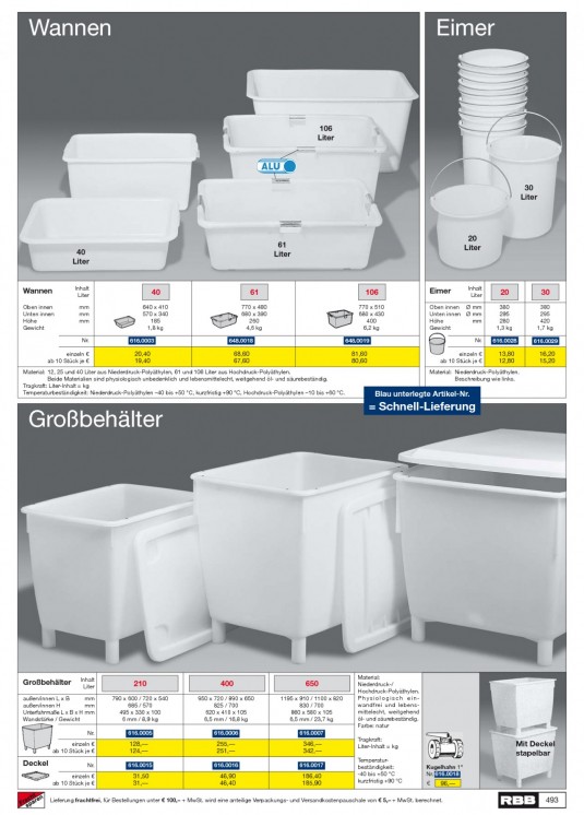 INHALT: Wannen Eimer 106 Liter 30 Liter 40 Liter 61 Liter 20 Liter Wannen Oben innen Unten innen Höhe Gewicht Inhalt Liter mm mm mm Nr. 40 640 x 410 570 x 340 185 1,8 kg 616.0003 61 770 x 480 680 x 390 260 4,6 kg 648.0018 106 770 x 510 680 x 430 400 6,2 kg 648.0019 Eimer Inhalt Liter 20 380 295 280 1,3 kg 616.0028 30 380 295 420 1,7 kg 616.0029 Oben innen Ø mm Unten innen Ø mm Höhe mm Gewicht Nr. einzeln ab 10 Stück je einzeln ab 10 Stück je 20,40 19,40 68,60 67,60 81,60 80,60 13,80 12,80 16,20 15,20 Material: 12, 25 und 40 Liter aus Niederdruck-Polyäthylen, 61 und 106 Liter aus Hochdruck-Polyäthylen. Beide Materialien sind physiologisch unbedenklich und lebensmittelecht, weitgehend öl- und säurebeständig. Tragkraft: Liter-Inhalt = kg Temperaturbeständigkeit: Niederdruck-Polyäthylen 40 bis +50 °C, kurzfristig +90 °C, Hochdruck-Polyäthylen 10 bis +60 °C. Material: Niederdruck-Polyäthylen. Beschreibung wie links. Blau unterlegte Artikel-Nr. Großbehälter = Schnell-Lieferung Großbehälter Inhalt Liter 210 790 x 600 / 720 x 540 685 / 570 495 x 330 x 100 6 mm / 8,9 kg 616.0005 400 950 x 720 / 890 x 650 825 / 700 620 x 410 x 105 6,5 mm / 16,8 kg 616.0006 650 1195 x 910 / 1100 x 820 830 / 700 860 x 580 x 105 6,5 mm / 23,7 kg 616.0007 außen/innen L x B mm mm außen/innen H Unterfahrmaße L x B x H mm Wandstärke / Gewicht Nr. einzeln ab 10 Stück je Material: Niederdruck-/ Hochdruck-Polyäthylen. Physiologisch einwandfrei und lebensmittelecht, weitgehend öl- und säurebeständig. Farbe: natur Tragkraft: Liter-Inhalt = kg Temperaturbeständigkeit: -40 bis +50 °C kurzfristig +90 °C 128, 124, 616.0015 255, 251, 616.0016 346, 342, 616.0017 Mit Deckel stapelbar Kugelhahn 1" Nr. 616.0018 Deckel Nr. einzeln ab 10 Stück je 31,50 31, 46,90 46,40 186,40 185,90 96, Lieferung frachtfrei, für Bestellungen unter 100, + MwSt. wird eine anteilige Verpackungs- und Versandkostenpauschale von 5, + MwSt. berechnet. 493