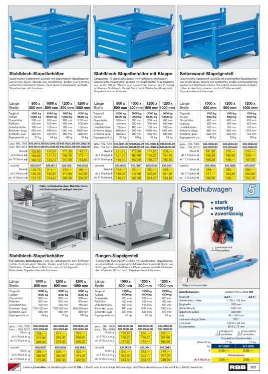 INHALT: Stahlblech-Stapelbehälter Geschweißte Kastenprofil-Eckfüße mit angekröpften Stapeltaschen aus einem Stück. Wände aus rundförmig, Böden aus V-förmig profiliertem Stahlblech. Oberer Rand durch Dreikantprofil verstärkt. Stapeltaschen mit Kranösen. Stahlblech-Stapelbehälter mit Klappe Längsseitig 1/2 Wand abklappbar, mit Flacheisenverschlüssen. Geschweißte Kastenprofil-Eckfüße mit angekröpften Stapeltaschen aus einem Stück. Wände aus rundförmig, Böden aus V-förmig profiliertem Stahlblech. Oberer Rand durch Dreikantprofil verstärkt. Stapeltaschen mit Kranösen. Seitenwand-Stapelgestell Geschweißte Kastenprofil-Eckfüße mit angekröpften Stapeltaschen aus einem Stück. Wände aus rundförmig, Boden aus trapezförmig profiliertem Stahlblech. Oberer Rand durch Dreikantprofil verstärkt. Unten an den Schmalseiten durch U-Profile versteift. Stapeltaschen mit Kranösen. Länge Breite 800 x 1000 x 1200 x 1200 x 500 mm 800 mm 800 mm 1000 mm 2000 kg 10000 kg 600 mm 500 mm 100 mm 860 mm 660 mm 44 kg 2000 kg 10000 kg 600 mm 500 mm 100 mm 1060 mm 660 mm 49 kg 2000 kg 10000 kg 6 00 mm 500 mm 100 mm 1060 mm 860 mm 56 kg Länge Breite 800 x 1000 x 1200 x 1200 x 500 mm 800 mm 800 mm 1000 mm 2000 kg 10000 kg 600 mm 500 mm 100 mm 860 mm 660 mm 46 kg 2000 kg 10000 kg 600 mm 500 mm 100 mm 1060 mm 660 mm 51 kg 2000 kg 10000 kg 600 mm 500 mm 100 mm 1060 mm 860 mm 58 kg Länge Breite Tragkraft Auflast Stapelhöhe Füllhöhe Unterfahrhöhe Einfahrbr. längs Einfahrbr. quer Eigengewicht ca. grau... RAL 7005 blau... RAL 5010 Stück ab 5 Stück je ab 10 Stück je verzinkt Stück ab 5 Stück je ab 10 Stück je 1000 x 800 mm 1500 kg 4500 kg 600 mm 450 mm 100 mm 860 mm 520 mm 48 kg 635.0032.30 635.0032.60 1200 x 800 mm 1500 kg 4500 kg 600 mm 450 mm 100 mm 1060 mm 520 mm 53 kg 635.0034.30 635.0034.60 1200 x 1000 mm 1500 kg 4500 kg 600 mm 450 mm 100 mm 1060 mm 720 mm 58 kg 635.0036.30 635.0036.60 2000 kg Tragkraft 10000 kg Auflast 500 mm Stapelhöhe 400 mm Füllhöhe 100 mm Unterfahrhöhe 660 mm Einfahrbr. längs 360 mm Einfahrbr. quer 27 kg Eigengewicht ca. 2000 kg Tragkraft 10000 kg Auflast 500 mm Stapelhöhe 400 mm Füllhöhe 100 mm Unterfahrhöhe 660 mm Einfahrbr. längs 360 mm Einfahrbr. quer 29 kg Eigengewicht ca. grau RAL 7005 635.0016.30 635.0018.30 635.0020.30 635.0022.30 blau RAL 5010 635.0016.60 635.0018.60 635.0020.60 635.0022.60 Stück ab 5 Stück je ab 10 Stück je verzinkt Stück ab 5 Stück je ab 10 Stück je grau RAL 7005 635.0024.30 635.0026.30 635.0028.30 635.0030.30 blau RAL 5010 635.0024.60 635.0026.60 635.0028.60 635.0030.60 Stück ab 5 Stück je ab 10 Stück je verzinkt Stück ab 5 Stück je ab 10 Stück je 120,80 108,60 100,10 635.0017 155,90 141,70 133,10 635.0019 171,20 156,10 147,50 635.0021 188,10 172, 163,50 635.0023 141,10 127,70 119,10 635.0025 176,20 160,80 152,20 635.0027 191,50 175,20 166,70 635.0029 209, 191,10 182,50 635.0031 181,90 166,40 158,20 635.0033 215, 198,20 190, 635.0035 224, 206, 197,50 635.0037 143,70 130,30 121,70 211, 192,80 184,20 233, 213,90 205,40 263, 242,90 234,30 164, 149,30 140,70 231, 212,90 204,30 253, 232,90 224,40 284, 261,90 253,40 236, 217, 208,50 263, 243,20 235, 282, 260,80 252,10 Füße mit Gabeltaschen. Behälter kann mit Drehsatzgerät gekippt werden. Gabelhubwagen · stark · wendig · zuverlässig Jahre Garantie 5 120 750 2 Lenkräder mit 1 Polyurethan Stahlblech-Stapelbehälter Für extreme Belastungen. Füße als Gabeltaschen zum Entleeren mittels Drehsatzgerät. Wände, Boden und Füße aus profiliertem Stahlblech. Oberer Rand in Rohrform und mit Schlagwulst. Extra breite Stapeltaschen mit Kranösen. Rungen-Stapelgestell Geschweißte Kastenprofil-Eckfüße mit angekröpften Stapeltaschen aus einem Stück. Längsseitig durch Knotenbleche versteift. Boden aus V-förmig profiliertem Stahlblech mit Quertraversen verstärkt. Umlaufender U-Rahmen, 80 mm hoch. Stapeltaschen mit Kranösen. Länge Breite Tragkraft Auflast Stapelhöhe Füllhöhe Unterfahrhöhe Einfahrbr. längs Einfahrbr. quer Eigengewicht ca. 1000 x 800 mm 2000 kg 8000 kg 620 mm 500 mm 120 mm 750/120 mm 585 mm 64 kg 1200 x 800 mm 2000 kg 8000 kg 620 mm 500 mm 120 mm 750/120 mm 585 mm 72 kg 1200 x 1000 mm 2000 kg 8000 kg 650 mm 500 mm 150 mm 850/220 mm 680 mm 100 kg Länge Breite Tragkraft Auflast Stapelhöhe Füllhöhe Unterfahrhöhe Einfahrbr. längs Einfahrbr. quer Eigengewicht ca. 1000 x 800 mm 1500 kg 4500 kg 600 mm 450 mm 100 mm 860 mm 520 mm 45 kg 1200 x 800 mm 1500 kg 4500 kg 600 mm 450 mm 100 mm 1060 mm 520 mm 50 kg 1200 x 1000 mm 1500 kg 4500 kg 600 mm 450 mm 100 mm 1060 mm 720 mm 53 kg 1 1 Vollgummi-Lenkräder Gabelhubwagen Tragkraft Gabelbreite x -tiefe Tragbreite Gesamtbreite Gabeltiefe außen Hub Lenkeinschlag je Seite Lenkräder Tandemrollen weitere Info s. Seite 564 2,5 t*) 1150 x 160 mm 520 mm 1425 mm 220 mm 85 200 mm 105 ° 200 Ø x 50 mm 80 Ø x 70 mm 2,5 t*) grau.... RAL 7005 blau.... RAL 5010 Stück ab 5 Stück je ab 10 Stück je verzinkt Stück ab 5 Stück je ab 10 Stück je 635.0056.30 635.0056.60 635.0058.30 635.0058.60 635.0060.30 635.0060.60 236, 216,90 208,30 635.0057 247, 226,90 218,40 635.0059 323, 298,90 290,30 635.0061 grau... RAL 7005 blau... RAL 5010 Stück ab 5 Stück je ab 10 Stück je verzinkt Stück ab 5 Stück je ab 10 Stück je 635.0038.30 635.0038.60 635.0040.30 635.0040.60 635.0042.30 635.0042.60 192,60 176,20 167,60 635.0039 208, 190,70 182, 635.0041 227, 207,90 199,20 635.0043 1 Lenkräder 1 Gewicht ca. Nr. ab 3 Stück je Vollgummi 2 Lenkräder 1 Polyurethan Polyurethan-Tandemrollen 77 kg 77 kg 971.0001 971.0002 289, 266,90 172,80 325, 300,90 292,30 425, 411,40 402,50 242, 222,90 214,30 262, 242, 233,50 288, 257,30 248,80 249, 239, 249, 239, 505 Sonderpreise Lieferung frachtfrei, für Bestellungen unter 100, + MwSt. wird eine anteilige Verpackungs- und Versandkostenpauschale von 5, + MwSt. berechnet.