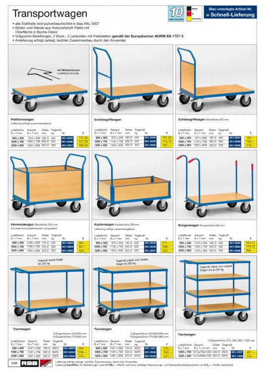 INHALT: Transportwagen Jahre Garantie 10 Made in Germany Blau unterlegte Artikel-Nr. = Schnell-Lieferung · alle Stahlteile sind pulverbeschichtet in blau RAL 5007 · Böden und Wände aus Holzwerkstoff-Platte mit Oberfläche in Buche-Dekor · Vollgummi-Bereifungen, 2 Bock-, 2 Lenkrollen mit Feststellern gemäß der Europäischen NORM EN 1757-3 · Anlieferung erfolgt zerlegt, leichter Zusammenbau durch den Anwender mit Winkelrahmen Ladefläche bündig Plattformwagen Lieferung erfolgt zusammengebaut Ladefläche B x T mm 850 x 500 1000 x 700 1200 x 800 Gesamt B x T mm Räder Tragkraft mm kg Nr. 951.0045 951.0046 951.0047 Schiebegriffwagen Ladefläche B x T mm 850 x 500 1000 x 700 1200 x 800 Gesamt B x T mm Räder Tragkraft mm kg Nr. 951.0048 951.0049 951.0050 Schiebegriffwagen Wandhöhe 500 mm 137,30 147,20 160,20 161,20 173,10 191, Ladefläche B x T mm 850 x 500 1000 x 700 1200 x 800 Gesamt B x T mm 970 x 509 1120 x 709 1320 x 809 Räder Tragkraft mm kg Nr. 160 Ø 400 200 Ø 500 200 Ø 500 951.0057 951.0058 951.0059 182, 194, 210, 910 x 509 160 Ø 400 1060 x 709 200 Ø 500 1260 x 809 200 Ø 500 970 x 509 160 Ø 400 1120 x 709 200 Ø 500 1320 x 809 200 Ø 500 Vierwandwagen Wandhöhe 500 mm mit einer herausnehmbaren Längsseiten Ladefläche B x T mm 850 x 500 1000 x 700 1200 x 800 Gesamt B x T mm Räder Tragkraft mm kg Nr. 951.0063 951.0064 951.0065 Kastenwagen Kastenhöhe 250 mm Lieferung erfolgt zusammengebaut Ladefläche B x T mm 850 x 500 1000 x 700 1200 x 800 Gesamt B x T mm Räder Tragkraft mm kg Nr. 951.0035 951.0036 951.0037 Rungenwagen Rungenhöhe 640 mm Ladefläche B x T mm 850 x 500 1000 x 700 1200 x 800 Gesamt B x T mm Räder Tragkraft mm kg Nr. 951.0084 951.0085 951.0086 287, 307, 329, 271, 298, 320, 1030 x 509 160 Ø 400 1180 x 709 200 Ø 500 1380 x 809 200 Ø 500 970 x 509 160 Ø 400 1120 x 709 200 Ø 500 1320 x 809 200 Ø 500 1070 x 509 160 Ø 400 1250 x 709 200 Ø 500 1450 x 809 200 Ø 500 164,10 175,10 189, Tragkraft obere Etage bis 200 kg. lere Tragkraft obere und mitt Etage bis 200 kg. Tragkraft obere und mittlere Etagen bis je 200 kg. Tischwagen 1 Tischwagen ) Etagenhöhen 220/865 mm 2 ) Etagenhöhen 270/905 mm 1 2 ) Etagenhöhen 220/550/865 mm ) Etagenhöhen 270/590/905 mm Tischwagen 1 Ladeflächen B x T mm 850 x 500 1000 x 700 1200 x 800 Gesamt B x T mm 1047 x 509 1197 x 709 1397 x 809 Räder Tragkraft mm Nr. kg 160 Ø 4001) 951.0863 200 Ø 5002) 200 Ø 5002) 951.0043 951.0044 246, 258, 278, Ladeflächen Gesamt B x T mm B x T mm Räder Tragkraft mm Nr. kg 850 x 500 1047 x 509 160 Ø 4001) 951.1331 1000 x 700 1197 x 709 200 Ø 5002) 951.0538 1200 x 800 1397 x 809 200 Ø 5002) 951.0539 ) Etagenhöhen 270, 590, 905, 1220 mm Räder Tragkraft mm Nr. kg 951.1007 951.1008 370, 390, 421, Ladeflächen Gesamt B x T mm B x T x H mm 1000 x 700 1210x709x1220 200 Ø 5001) 1200 x 800 1410x809x1220 200 Ø 5001) 497, 533, 548 Lieferung erfolgt zerlegt. Leichter Zusammenbau durch den Anwender. Lieferung frachtfrei, für Bestellungen unter 100, + MwSt. wird eine anteilige Verpackungs- und Versandkostenpauschale von 5, + MwSt. berechnet.