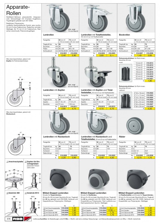 INHALT: ApparateRollen Stahlblech-Gehäuse glanzverzinkt, blaupassiviert. Schwenklager mit 2-fachem Kugelkranz. Tragfähigkeit getestet nach EN 12530. Radkörper: Polypropylen. Laufläche: thermoplastischer Gummi, grau spurlos. 50 mm Ø ohne Fadenschutz, Radachse vernietet, Gleitlager. Ab 75 mm Ø mit Fadenschutz, Radachse verschraubt, Präzisionskugellager. Abb. zeigt 75 mm Rad-Ø Lenkrollen Radgröße Tragkraft bis Bauhöhe Platte Schraubloch kg mm mm mm Nr. 50 mm Ø 75 mm Ø x 19 mm breit x 25 mm breit 50 69 60 x 60 48/38x48/38 016.0001 75 100 60 x 60 48/38x48/38 016.0002 Lenkrollen mit Totalfeststeller, 50 mm Ø nur mit Radfeststeller Radgröße Tragkraft bis Bauhöhe Platte Schraubloch kg mm mm mm Nr. 50 mm Ø 75 mm Ø x 19 mm breit x 25 mm breit 50 69 60 x 60 48/38x48/38 016.0004 75 100 60 x 60 48/38x48/38 016.0005 Bockrollen Radgröße Tragkraft bis Bauhöhe Platte Schraubloch kg mm mm mm Nr. 50 mm Ø 75 mm Ø x 19 mm breit x 25 mm breit 50 69 55 x 55 44/38,5x44/38,5 016.0007 75 100 67 x 60 48/40x48/40 016.0008 2,40 3,90 3,65 5, 1,45 3,65 Wie oben beschreiben, jedoch mit Zapfen für Rohreinsteckhülsen 11° Rohreinsteckhülsen für Rohr-innen: Bauhöhe 36 mm rund: 14 mm Ø 16 mm Ø 17 mm Ø 18 mm Ø 19 mm Ø 20 mm Ø 22 mm Ø 23 mm Ø Abb. zeigt 50 mm Rad-Ø 016.0014 016.0015 016.0016 016.0017 016.0018 016.0019 016.0020 016.0021 1,80 31 Lenkrollen mit Zapfen Radgröße Tragkraft bis Zapfen Bauhöhe 50 mm Ø 75 mm Ø x 19 mm breit x 25 mm breit kg 50 mm 11 Ø x 31 mm 72 mm 016.0010 Nr. 2,85 60 11 Ø x 31 103 mm 016.0011 Lenkrollen mit Zapfen und Totalfeststeller, 50 mm Ø nur mit Radfeststeller Radgröße Tragkraft bis Zapfen Bauhöhe 50 mm Ø 75 mm Ø x 19 mm breit x 25 mm breit kg 50 mm 11 Ø x 31 mm 72 016.0012 Nr. 4,15 75 11 Ø x 31 103 016.0013 Rohreinsteckhülsen für Rohr-innen: Bauhöhe 36 mm vierkant 16 x 16 mm 17 x 17 mm 18 x 18 mm 21 x 21 mm 22 x 22 mm 23 x 23 mm 26 x 26 mm 016.0022 016.0023 016.0024 016.0025 016.0026 016.0027 016.0028 4,75 5,70 2,20 Wie oben beschrieben, jedoch mit Rückenloch 11° Abb. zeigt 75 mm Rad-Ø Lenkrollen mit Rückenloch Radgröße Tragkraft bis Bauhöhe Achsloch Nabenlänge kg mm mm mm Nr. 50 mm Ø 75 mm Ø x 19 mm breit x 25 mm breit 50 69 016.0029 75 100 016.0030 Lenkrollen mit Rückenloch und Totalfeststeller, 50 mm Ø nur mit Radfeststeller Radgröße Tragkraft bis Bauhöhe Achsloch Nabenlänge kg mm mm mm Nr. 50 mm Ø 75 mm Ø x 19 mm breit x 25 mm breit 50 69 016.0032 75 100 016.0033 Räder Radgröße Tragkraft bis Bauhöhe Achsloch Nabenlänge kg mm mm mm Nr. 50 mm Ø 75 mm Ø x 19 mm breit x 25 mm breit 50 6,1 Ø 21,5 016.0035 75 6Ø 28,2 016.0036 2,20 3,90 3,40 4,50 0,75 1,70 1 Anschraubplatte 2 Zapfen für Ein1 schlaghülsen passende Hülsen siehe oben 38 27 38 27 11 30 4,4 3 Gewinde M8 1 M8 4 Gewinde M10 1 M10 Möbel-Doppel-Lenkrollen Einsatz für Teppichböden. 50 mm Ø x 55 mm breit. Bauhöhe 54 mm. Tragkraft bis 40 kg, getestet nach EN12528. Gehäuse und Doppelrolle aus Polypropylen. Gleitlager. Möbel-Doppel-Lenkrollen Einsatz für Hartböden. 50 mm Ø x 55 mm breit. Bauhöhe 54 mm. Tragkraft bis 40 kg, getestet nach EN 12528. Gehäuse und Doppelrolle aus Polypropylen. Rad-Laufläche aus thermoplastischem Gummi. Gleitlager. 1 2 1 3 1 4 1 mit Anschraubplatte mit Zapfen mit Gewinde M8 mit Gewinde M10 Nr. 016.0042 016.0043 016.0044 016.0045 Möbel-Doppel-Lenkrollen mit Radfeststeller und Einsatz für Teppichböden. 50 mm Ø x 54 mm breit. Bauhöhe 56 mm. Tragkraft bis 40 kg, getestet nach EN 12528. Gehäuse und Doppelrollen aus Polypropylen. Gleitlager. Nr. 016.0046 016.0047 016.0048 016.0049 25 25 1 2 1 3 1 4 1 mit Anschraubplatte mit Zapfen mit Gewinde M8 mit Gewinde M10 Nr. 016.0038 016.0039 016.0040 016.0041 1,30 1,60 1,05 1,05 2, 2,30, 1,75 1,75 1 2 1 3 1 4 1 mit Anschraubplatte mit Zapfen mit Gewinde M8 mit Gewinde M10 1,50 1,85 1,30 8,90 576 Lieferung frachtfrei, für Bestellungen unter 100, + MwSt. wird eine anteilige Verpackungs- und Versandkostenpauschale von 5, + MwSt. berechnet.