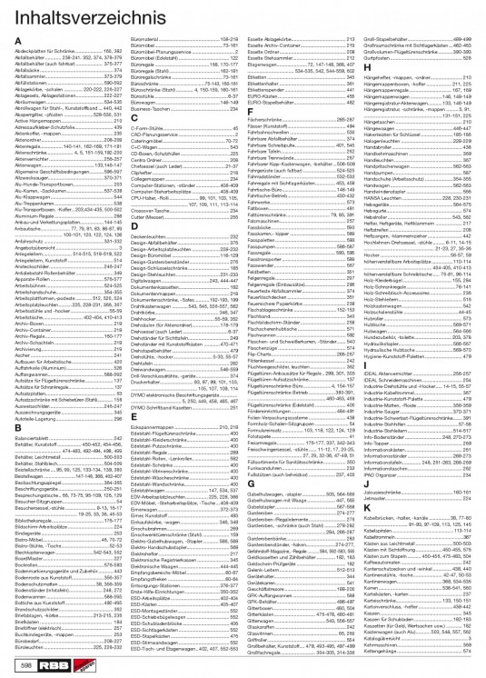 INHALT: Inhaltsverzeichnis A Abdeckplatten für Schränke ..................... 160, 382 Abfallbehälter ............ 238-241. 352, 374, 378-379 Abfallbehälter (auch fahrbar) .................... 375-377 Abfallsäcke ....................................................... 374 Abfallsammler ............................................373-379 Abfüllstationen...........................................590-592 Ablagekörbe, -schalen .............. 220-222, 226-227 Ablagesets, Ablagestationen .....................222-227 Abräumwagen ...........................................534-535 Abrollwagen für Stahl-, Kunststoffband ... 440, 442 Absperrgitter, -pfosten ......................528-530, 531 Active Hängemappen ....................................... 210 Adressaufkleber-Schutzfolie............................. 439 Aktenkoffer, -mappen ....................................... 235 Aktenordner ...............................................208-209 Aktenregale................. 140-141, 162-169, 171-181 Aktenschränke.................... 4, 5, 151-159,192-200 Aktenvernichter .........................................256-257 Aktenwagen........................................133,146-147 Allgemeine Geschäftsbedingungen...........596-597 Allzwecksauger..........................................370-371 Alu-Hunde-Transportboxen, ............................. 203 Alu-Karren, -Sackkarren ............................537-538 Alu-Klappwagen ............................................... 544 Alu-Treppenkarren ............................................ 538 Alu-Transportboxen, -Koffer .. 203,434-435, 500-502 Aluminium-Regale ............................................ 288 Anbau-und Verkettungsplatten..................144-145 Anbautische....................... 77, 79, 81, 83, 86-87, 89 ..................................... 100-101, 120, 122, 124, 126 Anfahrschutz .............................................331-332 Angebotsübersicht ............................................... 3 Anlegeleitern...................... 514-515, 518-519, 522 Anlegeleitern, Kunststoff .................................. 514 Ansteckschilder .........................................246-247 Antidiebstahl-Rollenbehälter ............................ 349 Apparate-Rollen ........................................576-577 Arbeitsbühnen ...........................................524-525 Arbeitshandschuhe....................................354-355 Arbeitsplattformen,-podeste ............ 512, 520, 524 Arbeitsplatzleuchten ..........225, 228-231, 366, 367 Arbeitsstühle und -hocker .............................55-59 Arbeitstische.............................. 402-404, 410-413 Archiv-Boxen .................................................... 219 Archiv-Container............................................... 219 Archiv-Regale ............................................160-177 Archiv-Schachteln ............................................ 219 Archivierung...................................................... 219 Ascher .............................................................. 241 Aufbauen für Arbeitstische ............................... 420 Auffahrkeile (Aluminium) ................................... 526 Auffangwannen..........................................588-592 Aufsätze für Flügeltürenschränke ..................... 137 Aufsätze für Schrankregale ...................................... 137 Aufsatzplatten..................................................... 63 Aufsatzschränke mit Schiebetüren (Stahl)............ 158 Ausweisschilder.........................................246-247 Auszeichnungsgeräte ....................................... 345 Autoteile-Lagerung ........................................... 296 Büromaterial ..............................................108-218 Büromöbel ...................................................73-161 Büromöbel-Planungsservice ................................ 2 Büromöbel (Edelstahl) ...................................... 122 Büroregale .........................................168, 170-177 Büroregale (Stahl) ......................................162-181 Büroregalschränke ......................................73-161 Büroschränke .....................................75-143, 160-161 Büroschränke (Stahl) ............. 4, 150-159, 160-161 Bürostühle .......................................................6-37 Bürowagen ................................................146-149 Business-Taschen ............................................ 234 Esselte Ablagekörbe......................................... 213 Esselte Archiv-Container .................................. 219 Esselte Ordner .................................................. 208 Esselte Stehsammler ........................................ 212 Etagenwagen.......................72, 147-148, 368, 407 ................................... 534-535, 542, 544-559, 602 Etiketten ........................................................... 345 Etikettenhalter .................................................. 361 Etikettenspender .............................................. 441 EURO-Kästen ................................................... 455 EURO-Stapelbehälter ....................................... 482 Groß-Stapelbehälter ..................................489-499 Großraumschränke mit Sichtlagerkästen ...462-463 Großvolumen-Flügeltürenschränke ...........390-393 Gurtpfosten ...................................................... 528 H Hängehefter, -mappen, -ordner........................ 210 Hängemappenboxen, -koffer ................... 211, 225 Hängemappenregale ................................ 167, 169 Hängemappenwagen ........................146, 148-149 Hängeregistratur-Aktenwagen...........133, 146-149 Hängeregistratur, -schränke, -mappen ......... 5, 91, ...........................................................131-151, 225 Hängetaschen .................................................. 210 Hängew